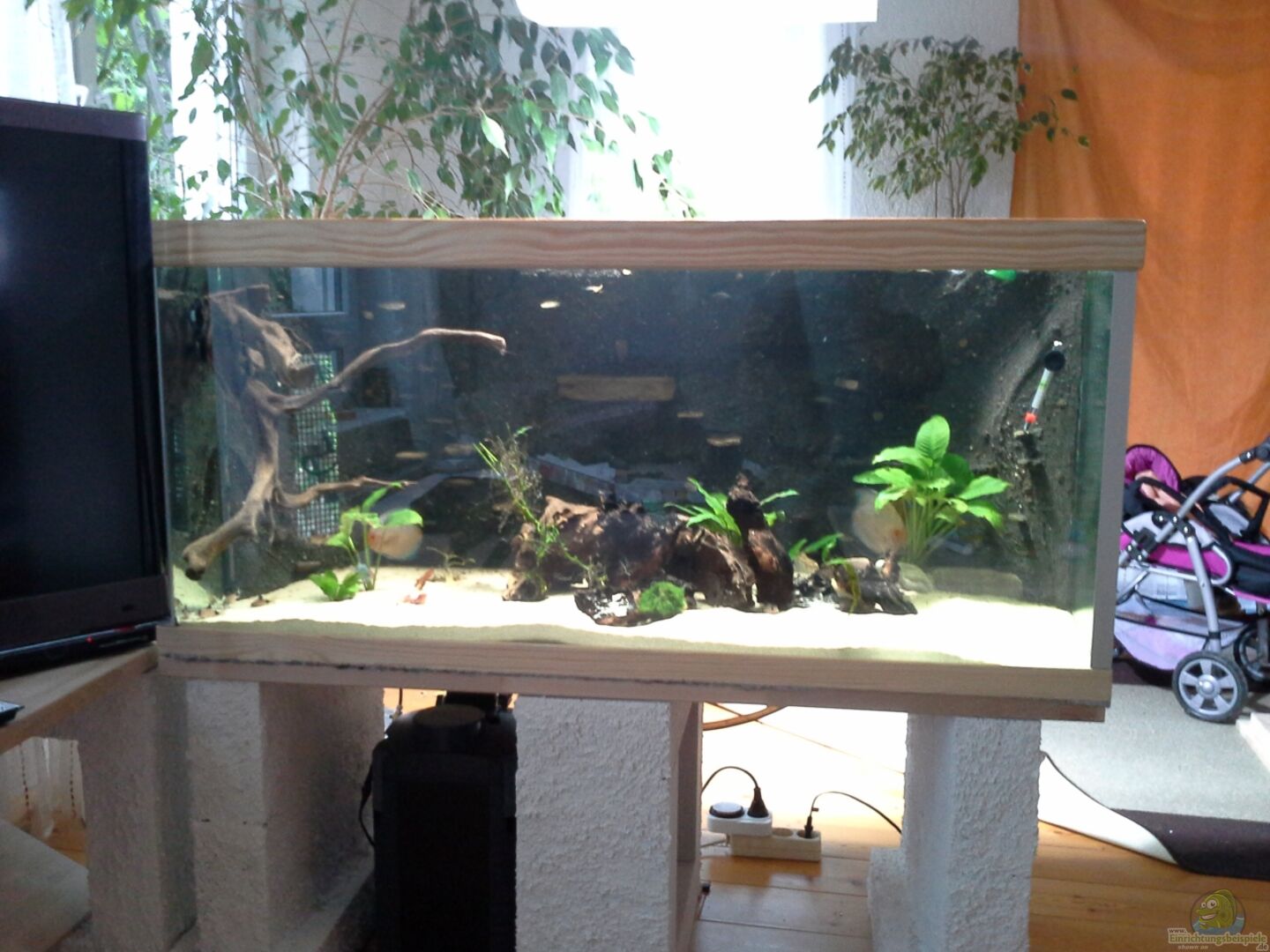 Das aquarium ist marke eigenbau, also ein altes becken komplett auseinadergeholt und neu verkebt, die rueckwand ist aus daemmplatten die mit kunstharz bearbeitet wurde.oben und unten wurden leisten in fichtenholz angebracht und an den ecken wurden aluleisten angeklebt.die obere abdeckung besteht aus plexiglas, die dreimal unterteilt ist.Selbst eingeklebte 3d rueckwand. An den seiten wurden ecken fuer diverse technik eingeklebt. Das becken läuft seit 5.2013 . Einen monat später kam der besatz. Co [...]