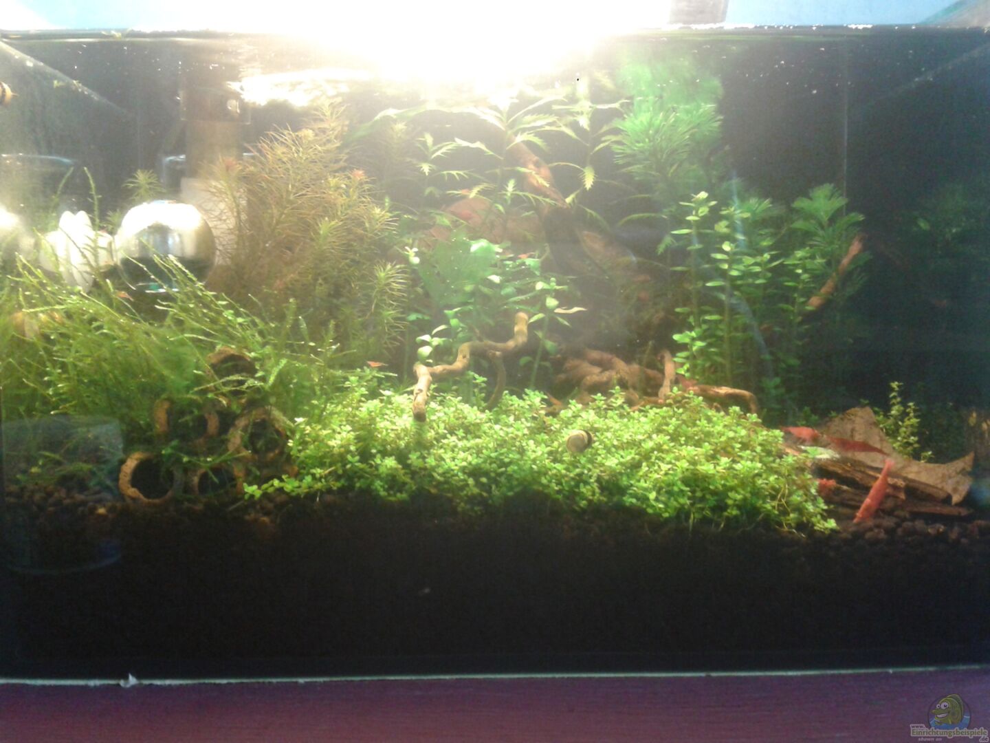 Zuchtbecken für Rote Taiwan Sakura Garnelen. Alle 3 Becken sind ein wenig im Aquascaping-Stil angelegt und sind durch den starken Pflanzenwuchs passend für die Bedürfnisse der Garnelen eingerichtet. Rückscheibe + eine Seitenscheibe sind für mehr Tiefenwirkung mit schwarzer Folie beklebt.