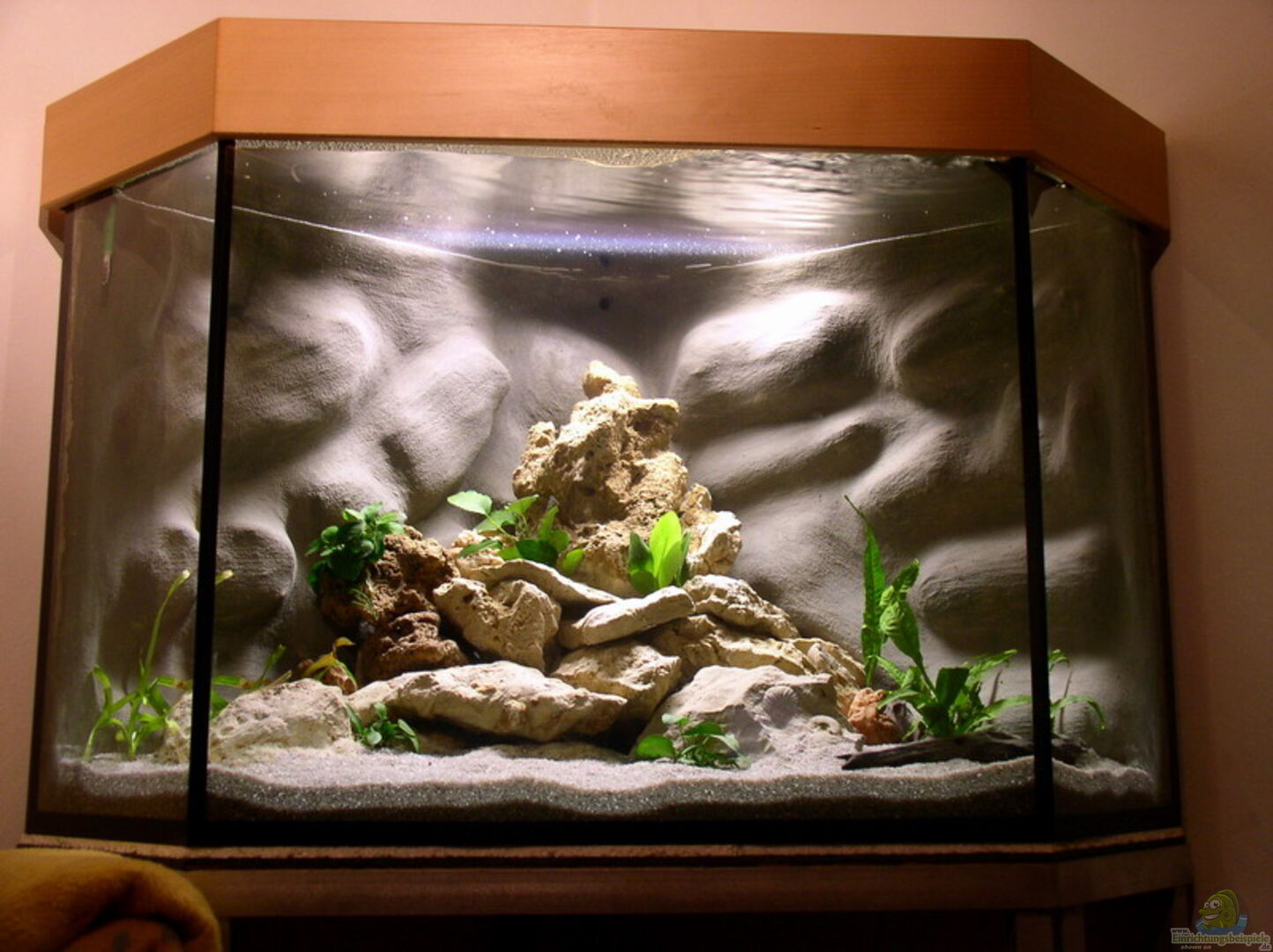 Es handelt sich hier um ein wulstverklebtes Deltabecken mit einer Schenkellänge von 85cm und einer Höhe von 70cm. HErzlichen Dank hier auch nochmal an Herrn Jebramek für den Bau. http://www.aqua-terra-jebramek.de/ Das Becken steht stabil auf einen selbstgebauten Unterschrank aus 35mm 4-kant Eisenrohren, die zwischen zwei Rahmen aus L-Eisen geschweißt wurden. Im oberen Rahmen liegt eine 40mm Küchenarbeitsplatte und darauf eine 10mm starke Styroporplatte und nochmals einer Aquariumunterlage [...]
