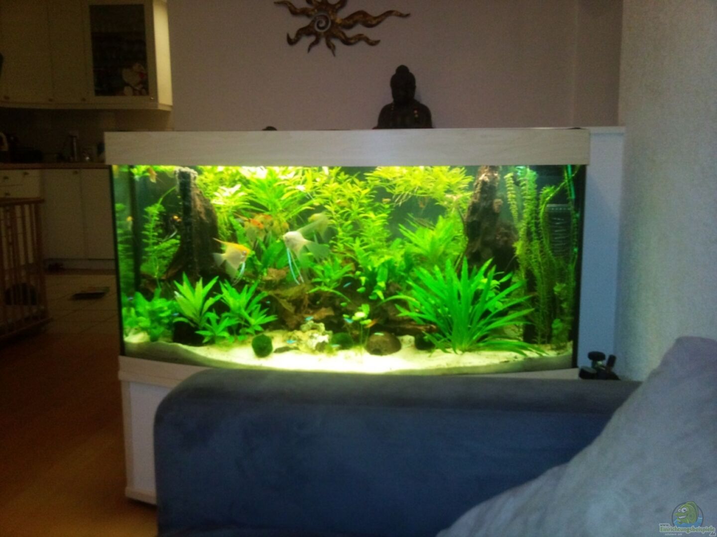 Unterschrank Eigenbau aus 25mm MDF-Platten Becken mit Dekorfolie optisch angepasst (Birkendekor statt Buche) Rückwand Spiegelfolie (Vergrössert das AQ optisch enorm)