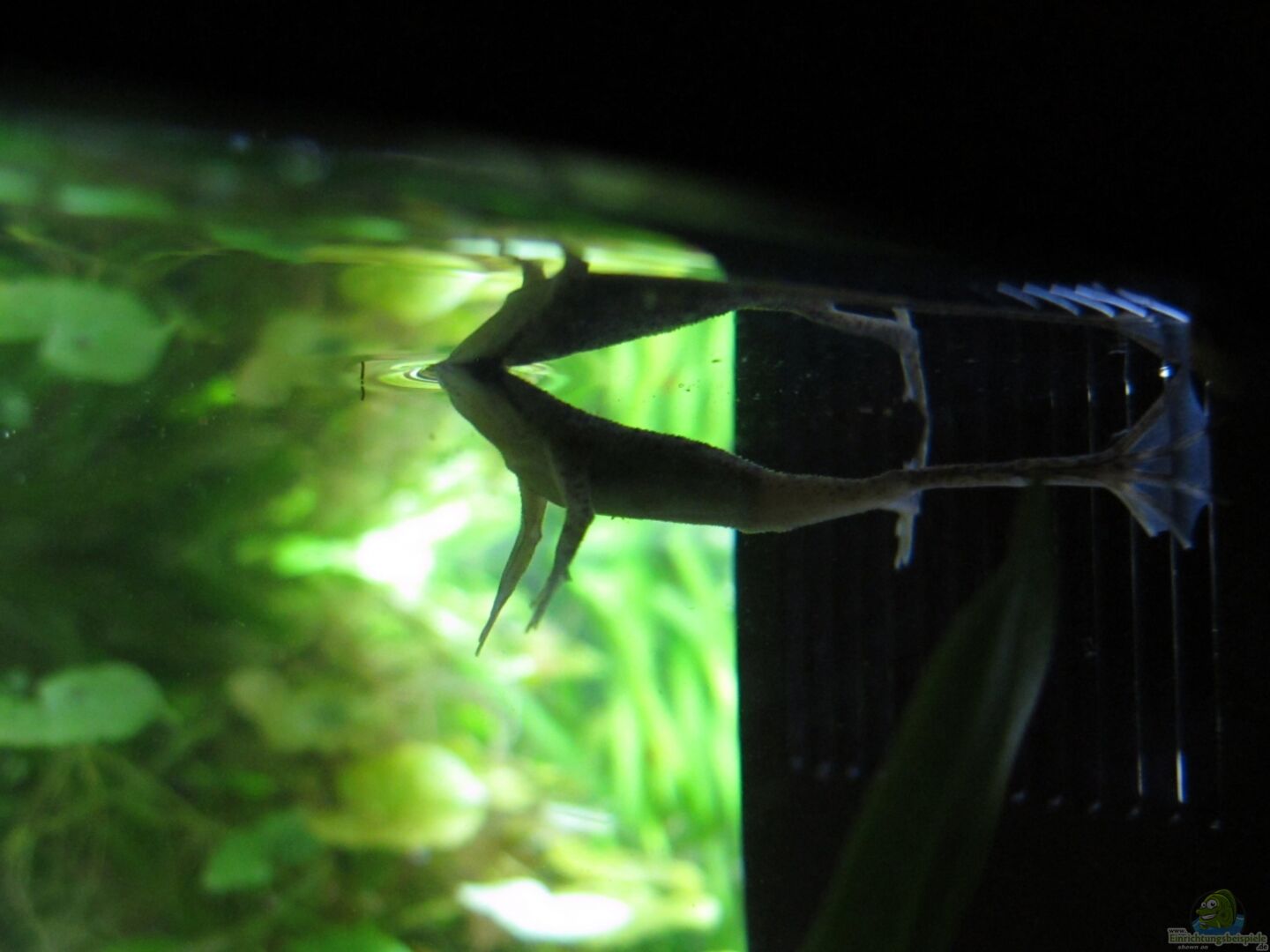 10 Kardinalfische (Tanichthys albonubes), 5 Männchen 5 Gefleckte Panzerwelse (Corydoras ambiacus) 3 Platys (Xiphophorus maculatus), (noch) 3 Babyfische 2 Zwergkrallenfrösche (Hymenochirus boettgeri), vermutlich beides Weibchen 2 Rennschnecken (Neritina natalensis) War beim Fischbesatz in der Anzahl noch zurückhaltend.