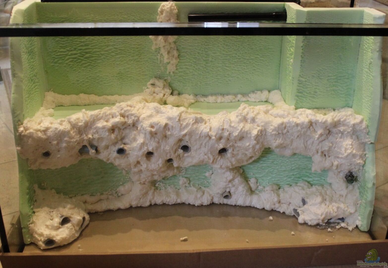 Hier entsteht ein Vivarium/ Riparium mit einem Wasserteil von ca. 60 Liter. Es handelt sich um ein Standardbecken mit Abdeckung. Im Landteil sollen unterschiedlich feuchte Bereiche entstehen. Ein kleiner Wasserlauf/ Wasserfall soll in einer Wasserlache (max. 2cm tief) enden und der ??berlauf der Lache soll in den Wasserteil flie??en. Durch dichte Bepflanzung werden helle und schattige Bereiche entstehen. Zwischen Steinen, Wurzeln und Pflanzen werden zahlreiche Versteckmöglichkeiten zu finden sein. [...]