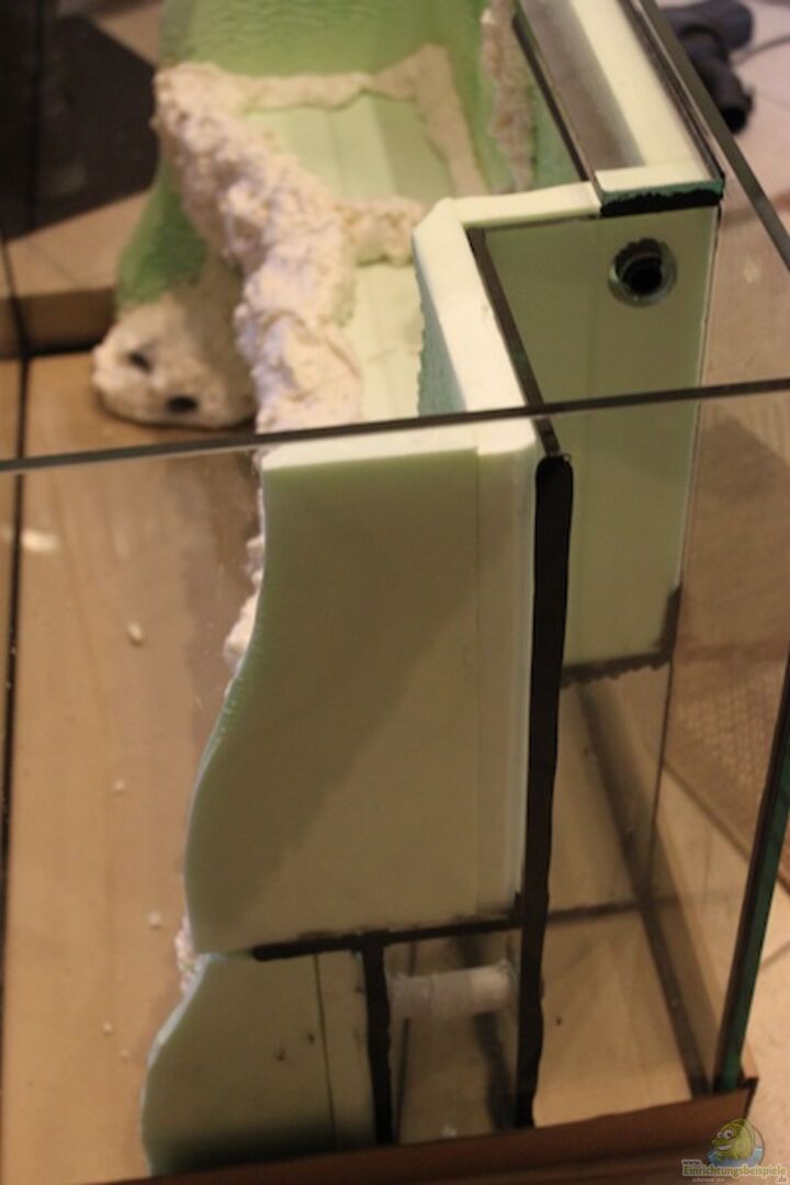 Hier entsteht ein Vivarium/ Riparium mit einem Wasserteil von ca. 60 Liter. Es handelt sich um ein Standardbecken mit Abdeckung. Im Landteil sollen unterschiedlich feuchte Bereiche entstehen. Ein kleiner Wasserlauf/ Wasserfall soll in einer Wasserlache (max. 2cm tief) enden und der ??berlauf der Lache soll in den Wasserteil flie??en. Durch dichte Bepflanzung werden helle und schattige Bereiche entstehen. Zwischen Steinen, Wurzeln und Pflanzen werden zahlreiche Versteckmöglichkeiten zu finden sein. [...]