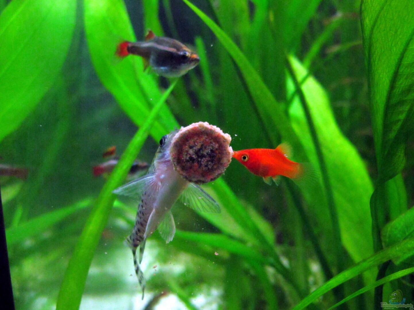 10 Kardinalfische (Tanichthys albonubes), 5 Männchen 5 Gefleckte Panzerwelse (Corydoras ambiacus) 3 Platys (Xiphophorus maculatus), (noch) 3 Babyfische 2 Zwergkrallenfrösche (Hymenochirus boettgeri), vermutlich beides Weibchen 2 Rennschnecken (Neritina natalensis) War beim Fischbesatz in der Anzahl noch zurückhaltend.