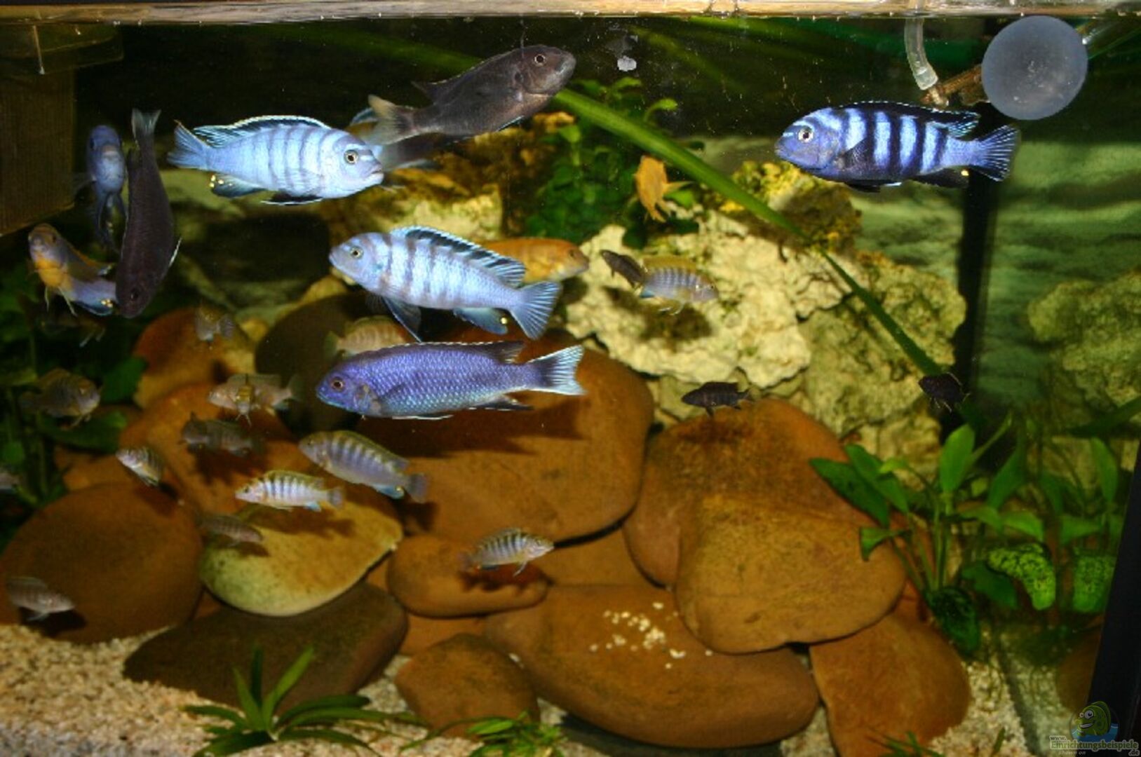Das Becken ist offen gestaltet, d.h. ohne Abdeckung. Damit die Bewohner nicht auf die dumme Idee kommen, den vorgelagerten Teppich zu erkunden, sind zwei Plexiglasscheiben aufgelegt, in denen sich eingesägte Fütterungslöcher befinden. Das Aquarium steht auf einem stabilen Stahlregal, das mit Holz verkleidet wurde.
