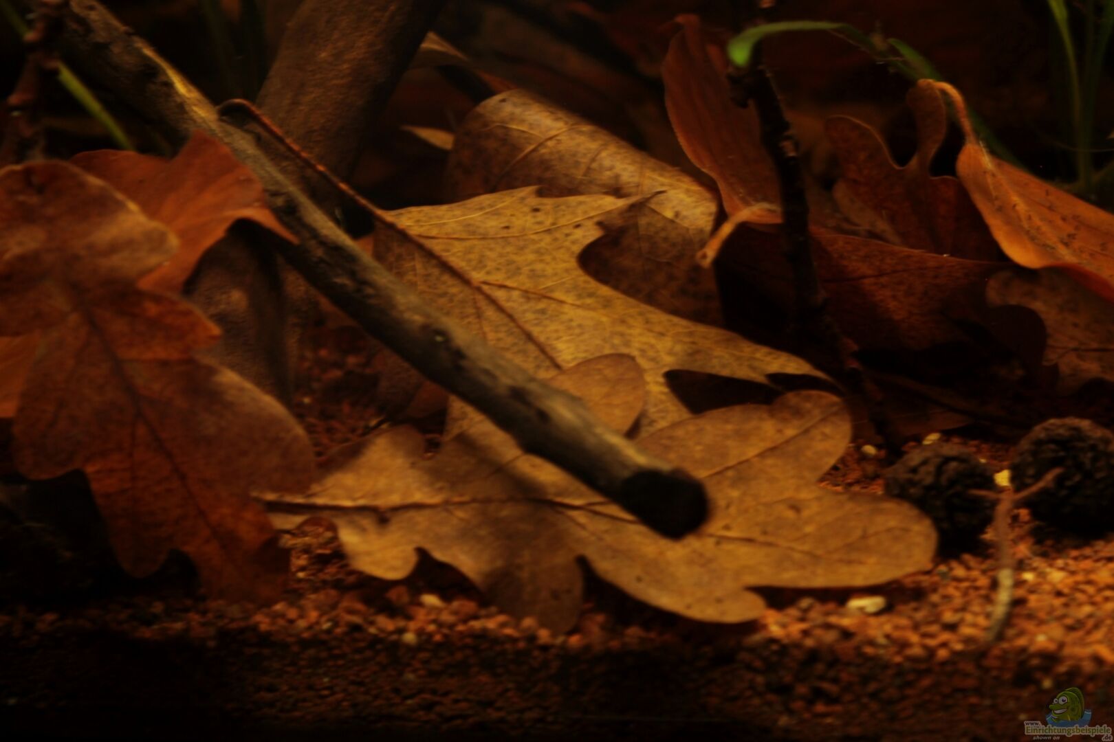 Moorhölzer verschiedener Grö??en Buchenäste Erlenäste viel Laub: Erle, Buche, Eiche, Banane, Seemandel, Erlenzapfen das Laub wird ca alle zwei Wochen gewechselt, denn spätestens nach dieser Zeit, sind die guten Eigenschaften des Laubes versiegt. Es befinden sich nicht immer alle Sorten zusammen im Becken, hier wird öfters mal getauscht und gemischt. Erlenzapfen sind ebenfalls im Becken, hier sollten es nicht zu viele sein, es sei denn man möchte richtig schwarzes Wasser. [...]