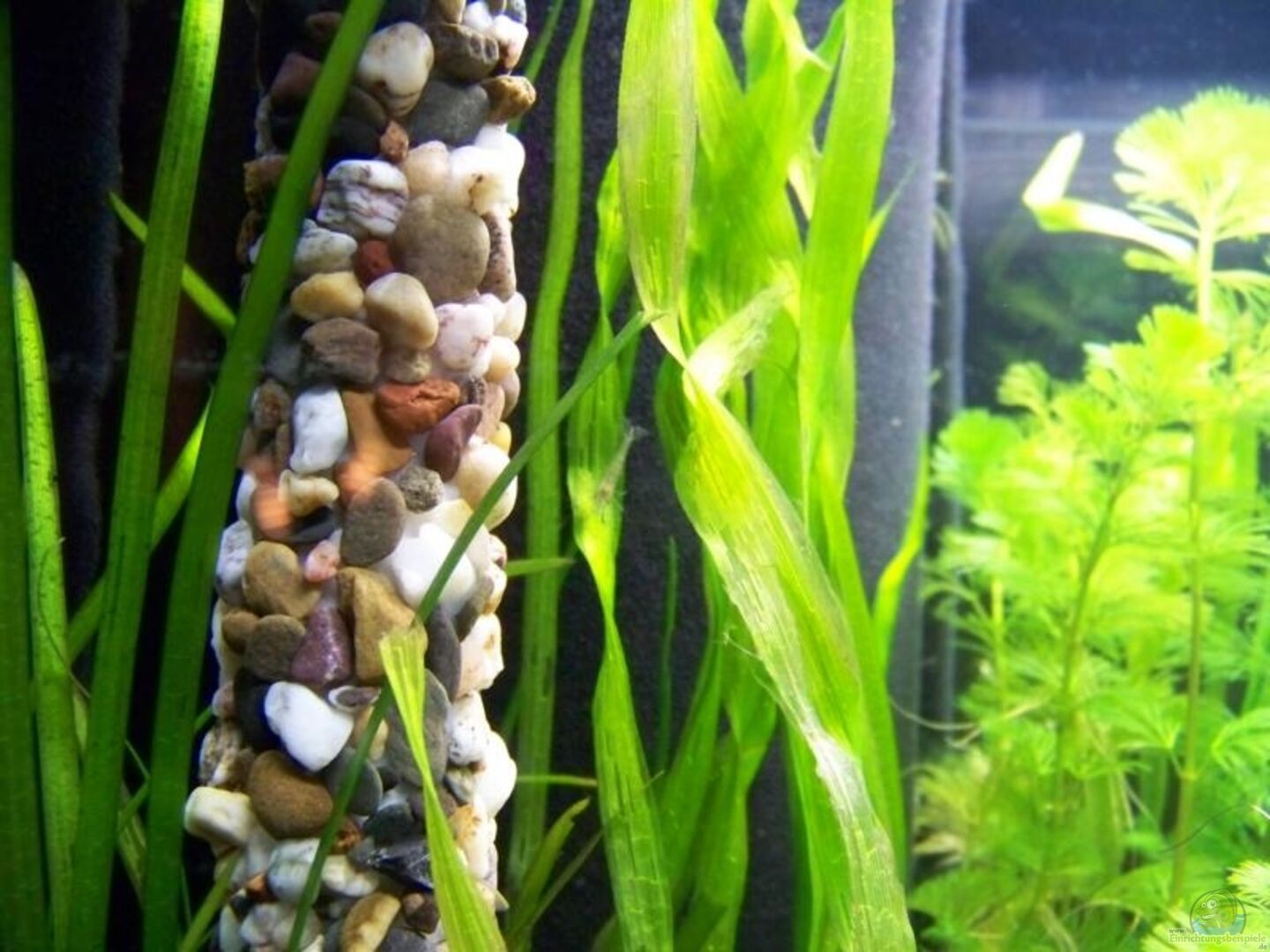Mopani Wurzel Lavasteine ein selbstgebauter Garnelenstamm (Plastikrohr mit ca. 6 mm gro??en Löchern, mit Aquasilikon bestrichen und mit Kies beklebt), ca. 45 cm hoch Anker aus schwarzem Speckstein, wasserneutral