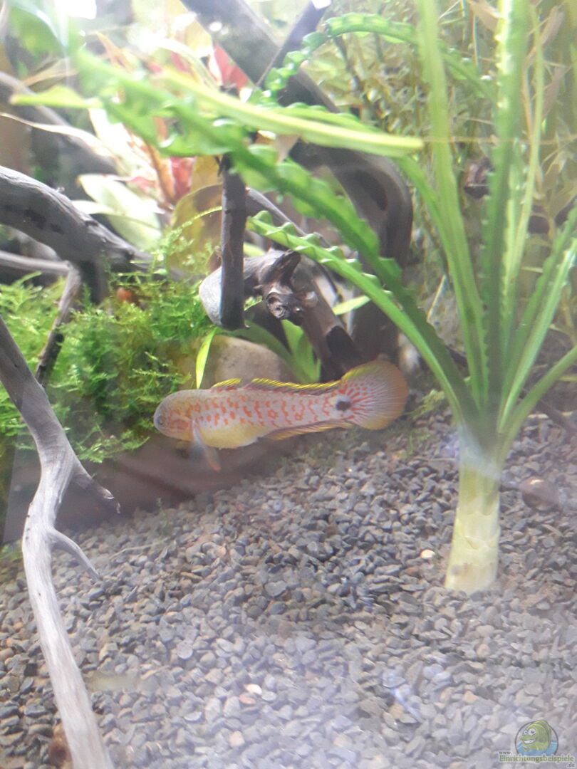 Rechts im Hintergrund wiegen sich Riesenvalisnerien in der sanften Strömung, die sich sanft über die Oberfläche legen und das Becken dort schön schummrig wirken lassen. Javafarn scheint aus einer zentral platzierten Wurzel zu spriessen. Daneben dienen zwei Cryptocoryne wendtii brown auch mal als grossblättrige Pflanze zum ausruhen oder als Schneckenrutsche. Aufgebunden auf den Wurzelspitzen finden sich Weepingmoos, Bucephalandra(Wavy Leaf) und Anubias barteri nanaPangolino. Links im Hintergrund [...]