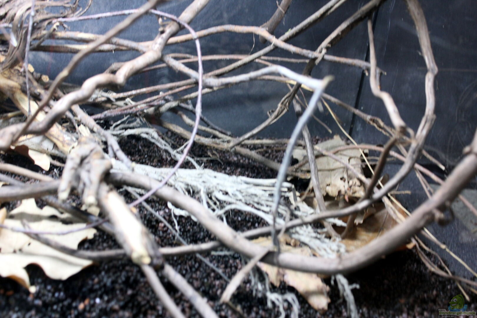 Erlenholz(Wurzelstücke) Die Hauptäste wurden extra mit bewachsener Symbioseflechte ausgesucht. Die sogenannte Gelbflechte geht mit Grünalgen eine Symbiose ein. Sie bildet in Ihrer Au??enepidermis Kristalle aus die den Symbiosepartner vor Austrocknung schützen. Je nach UV Intentisität variiert die Farbe von gelb bis grün Erlenzweige verschiedene Laubelemente, hier vor allem Herbstlaub und getrocknete Ficusblätter, desweiteren getrocknetes Sumpfgras