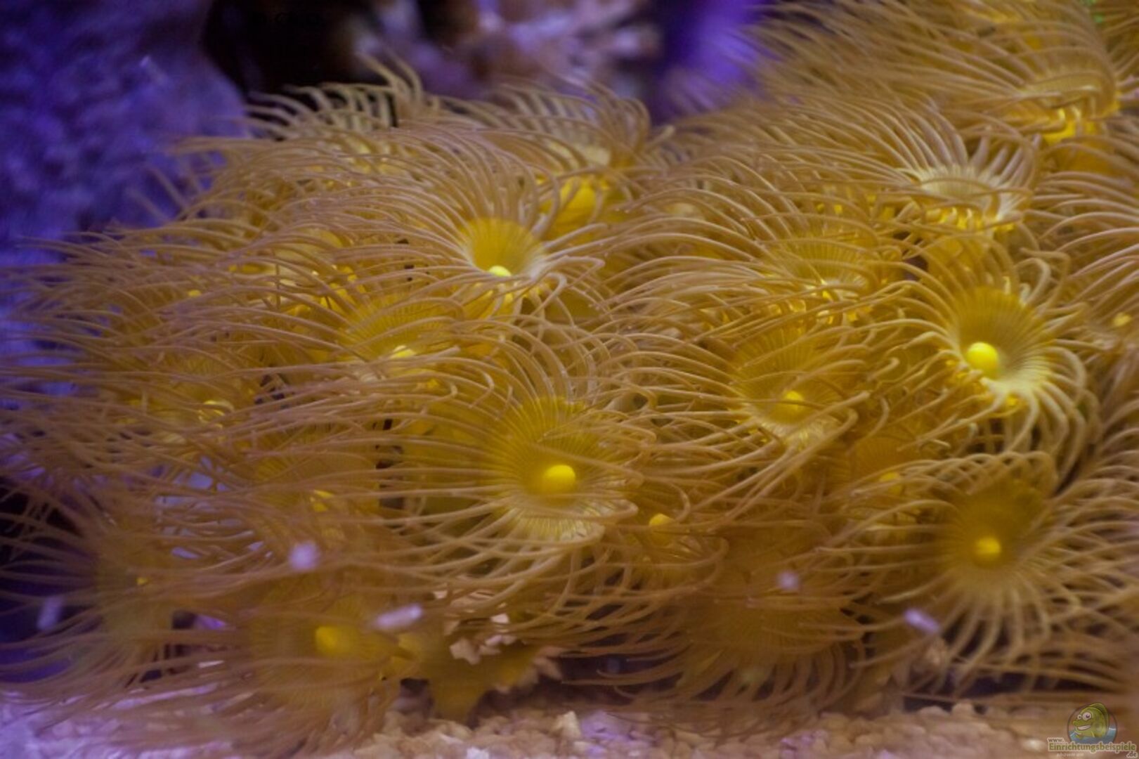 Grüne Röhrenkoralle; Keniabäumchen; Grüne-, Gelbe- und Rote-Kusten; Sinularia, Grüne- und Mintgrüne-Caulastrea, Mini-Ableger einer Euphyllia, Lila Ohrenschwamm, Stylophora Milka, Fungia, Blaue-Scheiben, Rhodactis Scheiben, Xenia-Elongata, zwei Turboschnecken, drei rote Einsiedler
