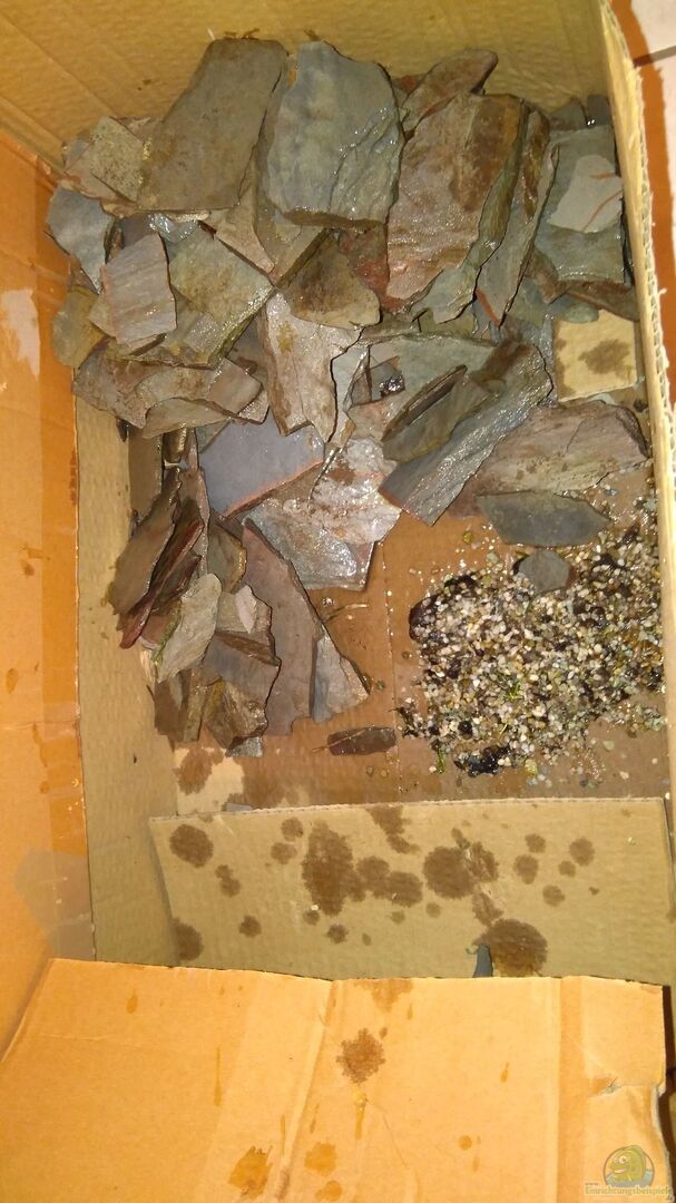 Schieferterrasse aus gesammelten Naturschiefer mit 5 versteckten Höhlen (verklebt mit Aquariumsilikon), eine vergrabene Kokoshöhle im Grund , 3 Seemandelbaumrindenhöhlen, Kunstterrasse, Juwel grey Stone Rückwand, 2 Moorwurzeln und etwas einzelnes Holz, 10 kg Ardenner Brocken Kalksteine und 2 wei??e Lochgesteine.