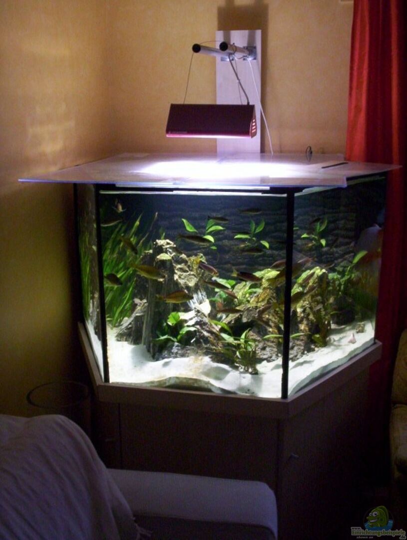 Hexagon Von Spitze zu Spitze 120 cm ; Breitseite zu Breitseite 105 cm Sonderanfertigung aus 12 mm Glas, mit schwarzem Silikon wulstverklebt Innen liegende Filterkammer mit zwei Bohrungen 45 mm und 60 mm 45 mm Ablauf aus der Rieselkammer 60 mm Versorgungsschacht für Kabel & Schläuche
