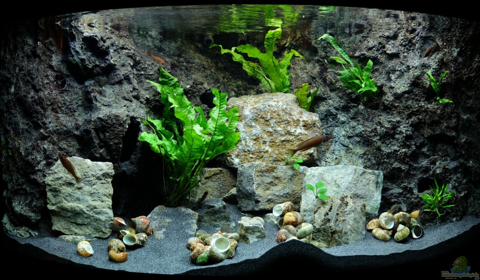 - Eckaquarium (Fluval Venezia 350) - gebogene Frontscheibe - Glasdurchführung für Au??enfilter - Rückwand von Steinzeit (Barsch-Rückwand mit Höhlen)