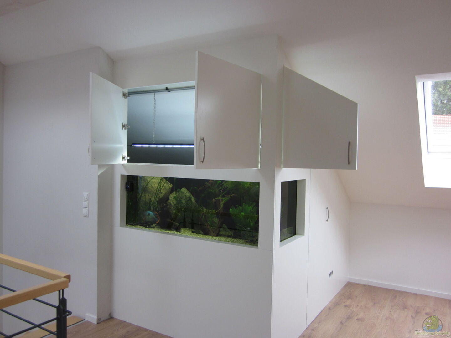 Dies Becken ist eine Ma??anfertigung in 15mm Floatglas und wurde Vorort verklebt. Das Becken steht in einer Wanne, die an den Abfluss angeschlossen ist. An einer Stirnseite gibt es 5 Bohrungen. - Hier ist der Tunze WallOverflow montiert. - Notüberlauf direkt in den Ablauf - Servicezugang für die Mulmglocke. Ebenfalls direkt in den Abfluss - Frischwasserzulauf. - Wasserrücktransport vom Filterbecken Abgedeckt wird das Becken über Schiebescheiben, die in Alu Sonderprofilen laufen. Umbaut [...]