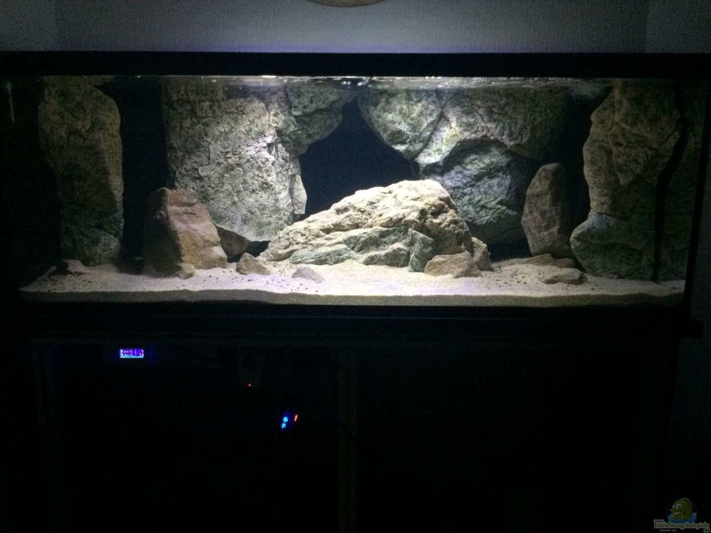 Becken aus 10mm Floatglas von JEKO-Aquaristik. Das Becken ist dreiseitig mit opaker Folie in schwarz matt beklebt. Rechte Seitenscheibe teilweise Kontur ausgeschnitten. Abgedeckt mit 4 Stück 4mm Scheiben. Jeweils rechts & links vom Mittelsteg 2 Stück die in schwarzen E-Profilen geführt werden. Diese liegen auf den längs verklebten Stegen. Somit kann ich die Abdeckscheiben relativ einfach bewegen - quasi Schiebetüren als Abdeckung. Unterbau besteht aus 45mm Alu-Profilen von Aluprofiltechnik [...]