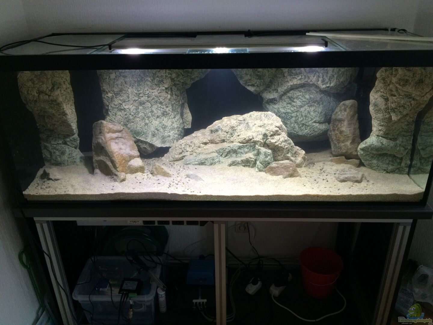 Becken aus 10mm Floatglas von JEKO-Aquaristik. Das Becken ist dreiseitig mit opaker Folie in schwarz matt beklebt. Rechte Seitenscheibe teilweise Kontur ausgeschnitten. Abgedeckt mit 4 Stück 4mm Scheiben. Jeweils rechts & links vom Mittelsteg 2 Stück die in schwarzen E-Profilen geführt werden. Diese liegen auf den längs verklebten Stegen. Somit kann ich die Abdeckscheiben relativ einfach bewegen - quasi Schiebetüren als Abdeckung. Unterbau besteht aus 45mm Alu-Profilen von Aluprofiltechnik [...]
