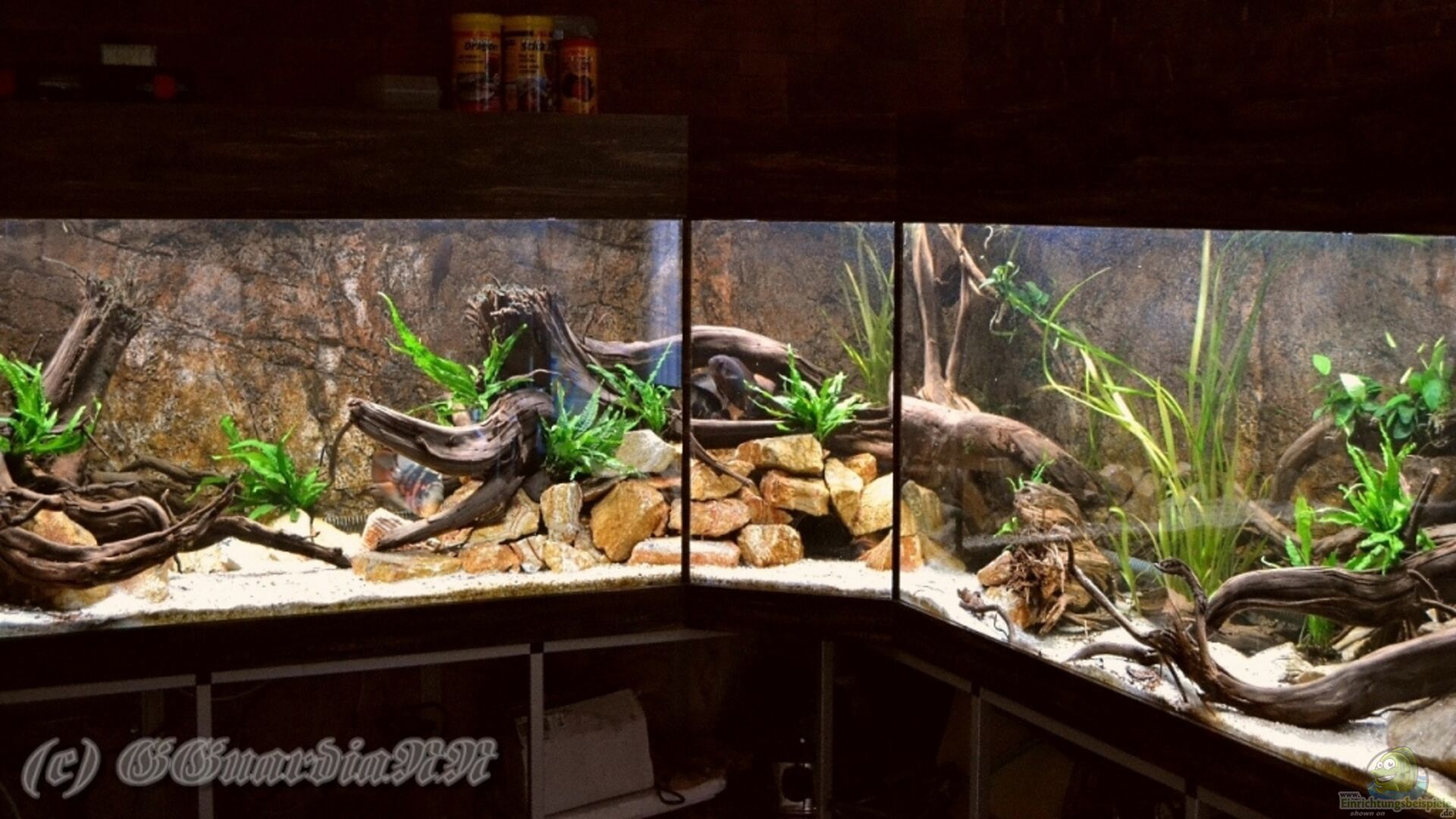Das Aquarium: Das Becken ist von seinen Ma??en und seiner Form komplett selbst geplant. Es wurde von meinem Bruder Oliver und mir selbst vor Ort verklebt, die Glasstärke beträgt 12 mm (reicht für eine Höhe von 75 cm, ca. 14, 7 qm Float-Glas), dank der sehr sauberen Schnittkanten musste das Glas nicht geschliffen werden, die Kanten wurden mit einem Schleifschwamm nur leicht gebrochen. Es ist mit schwarzem Silikon auf Stoss verklebt, die Schräge vorne ist wulstverklebt, innen hat es rundherum [...]