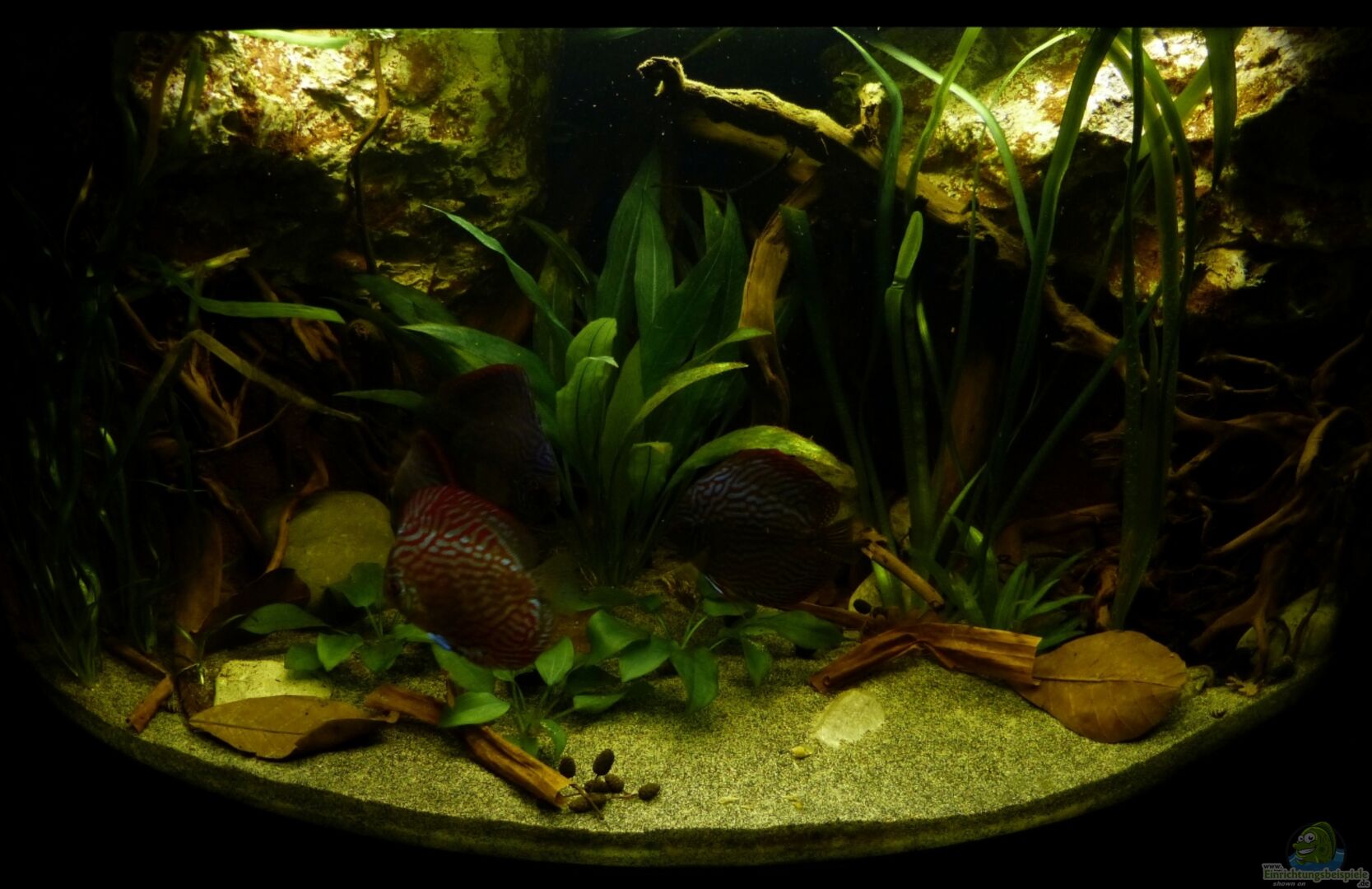 Ein paar Daten zum Aquarium vorweg: - wei??es Juwel Trigon 350 auf wengefarbenem Unterschrank mit wei??en Türen Schenkellänge 87 cm max.Tiefe 87 cm Gesamtbreite ca. 123 cm Floatglas: 15 mm - selbstgebauter Innenfilter in der hinteren Ecke - Aquarienabdeckung mit 2 Leuchtbalken, eigentlich mit 2 x 45 Watt T5 und 2 x 24 Watt T5 Leuchtbalken. Diese wurden auf LED-Beleuchtung "umgebaut"