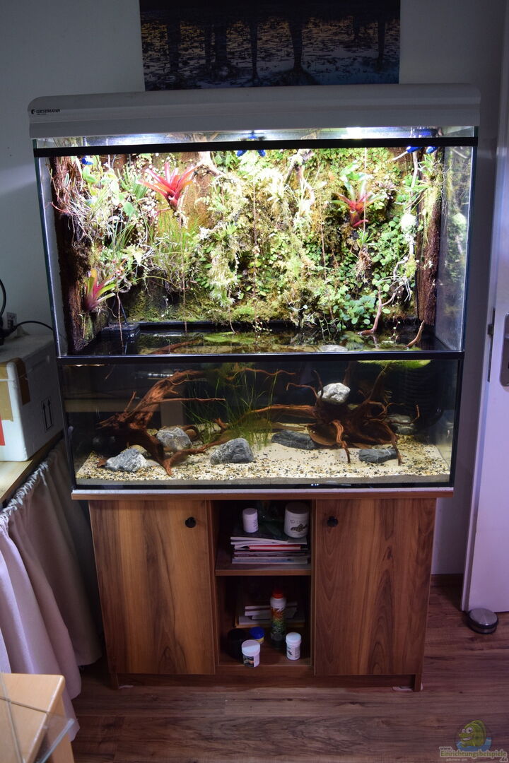 Sonderanfertigung von Aquarien und Terrarienbau Jebramek in Nürnberg. Der Wasserstand beträgt 35 cm. Ein mit Kabelbindern zusammen gebundenes Aluminium-Gestell befindet sich in der Abdeckung und fungiert als Decke, um darin Wurzeln anzubinden, die ebenso mit Kabelbindern zusammengehalten werden. Weiterhin hängen von der Decke künstlich erstellte Lianen. Sie wurden aus Paketschnur, Aquariensilion und einer Mischung aus gehäckselten Xaxim- und Weisstorf-Resten erstellt. Um das Ganze noch natürlicher [...]