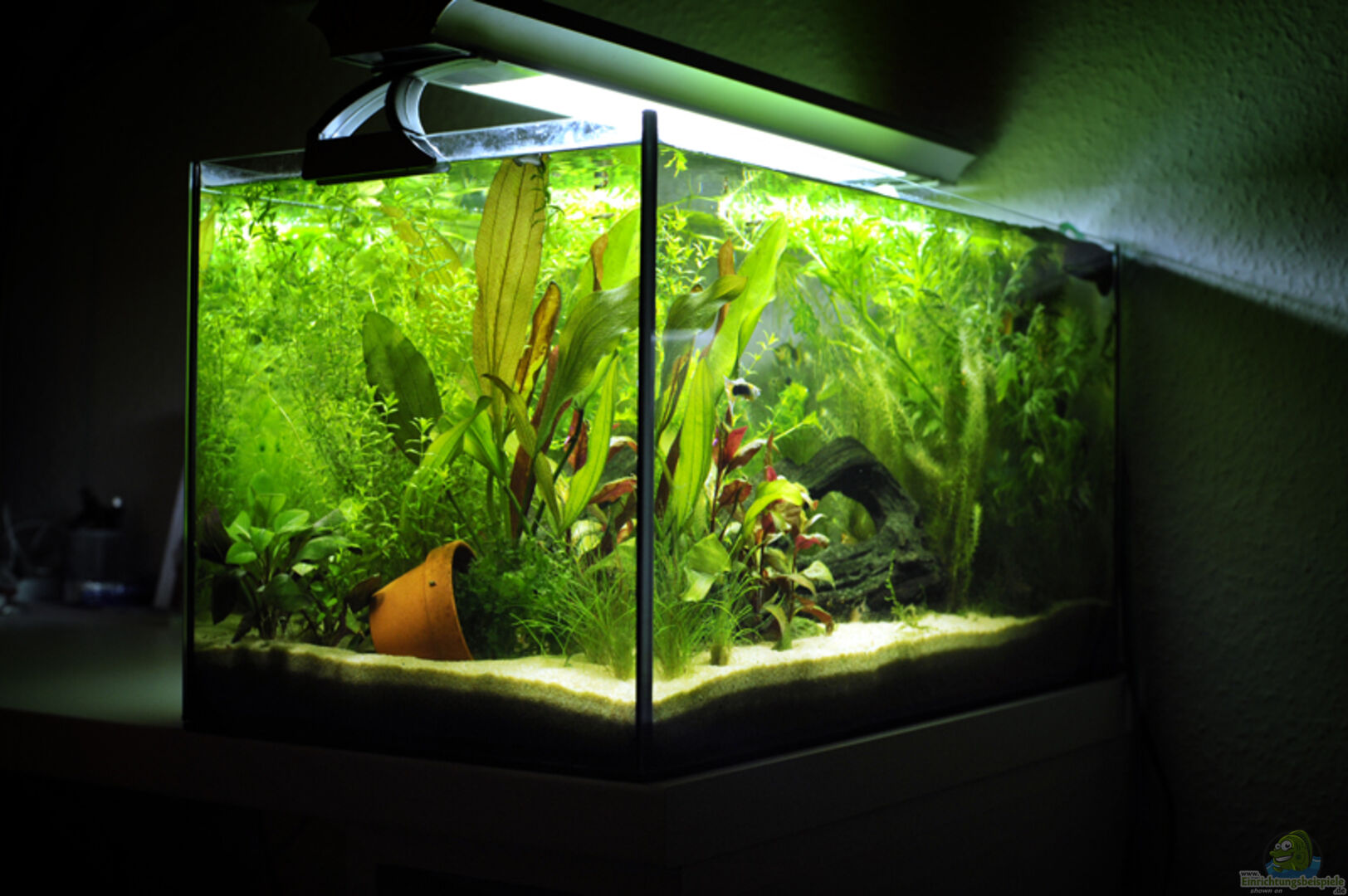 Das Aquarium steht auf dem Schreibtisch, quasi als kleiner Raum-/Blicktrenner zum Sofa hin. Man kann also von beiden Seiten auf die jeweils lange Seite des Beckens schauen. Deshalb ist auch keine klassische Bepflanzung in Form von Vorder- und Hintergrundpflanzen vorhanden, da man ja sowohl vom Schreibtisch als auch vom Sofa aus etwas sehen möchte.