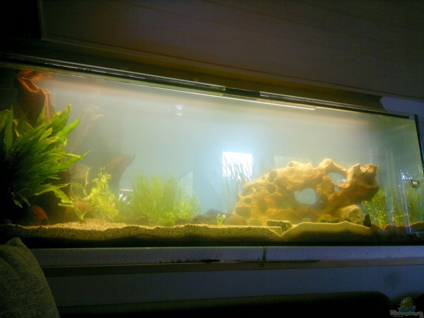 Das Becken ist mit der schmalen Seite zur Wand aufgestellt und dient als Sichtschutz. Au??erdem haben weder Unterschrank noch Becken Bohrungen weshalb ich mir mit Innenfiltern behelfen werde.