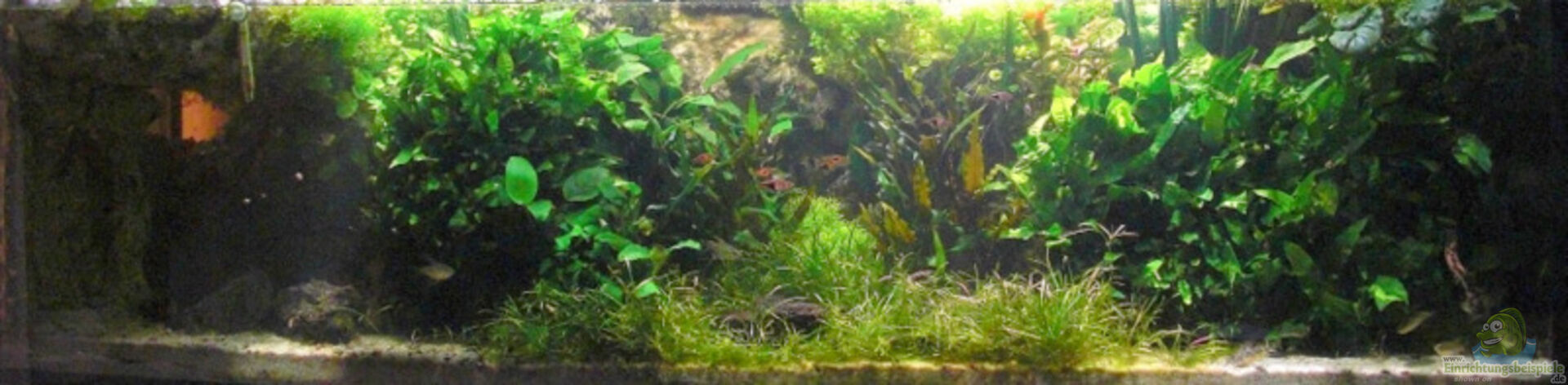 Selbstgebaute Rückwand (inkl. Landteil) aus Styropor, PU-Schaum, einer Trasszement-Sandmischung und Acryl-/Abtönfarbenfarben nach der Anleitung von Robert Bröhl (Anleitung: www.aquarieneinrichtung.net; Gesamt-Bauzeit: knapp 3 Wochen). Offenes Becken, einer Uferlandsachft nachempfunden (mit dicht bepflanzter 15 cm Wasserstandszone, in der die Barsche gerne laichen und sich die Jungfische verstecken).