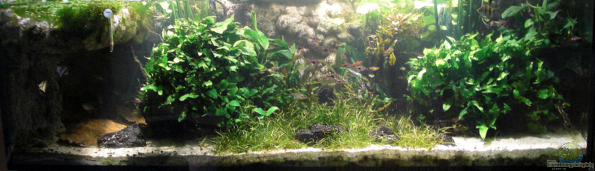 Selbstgebaute Rückwand (inkl. Landteil) aus Styropor, PU-Schaum, einer Trasszement-Sandmischung und Acryl-/Abtönfarbenfarben nach der Anleitung von Robert Bröhl (Anleitung: www.aquarieneinrichtung.net; Gesamt-Bauzeit: knapp 3 Wochen). Offenes Becken, einer Uferlandsachft nachempfunden (mit dicht bepflanzter 15 cm Wasserstandszone, in der die Barsche gerne laichen und sich die Jungfische verstecken).