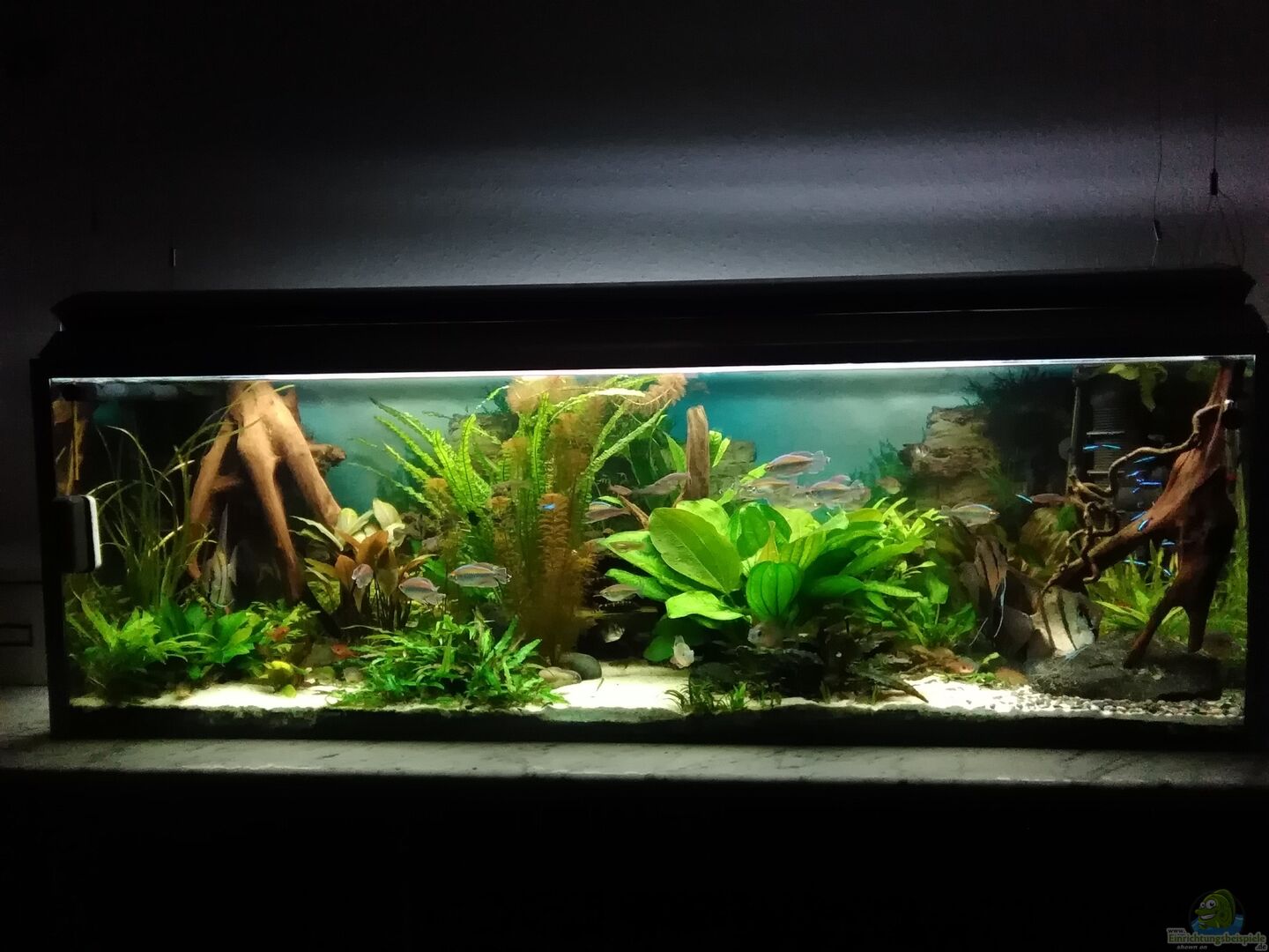 Juwel-Becken, 8 mm Float-Glas, Bodenscheibe 10 cmm Verkleidet von uns mit L-Aluschienen zur besseren Optik auf selbst gezimmertem Tisch, Filter stehen rechts und links