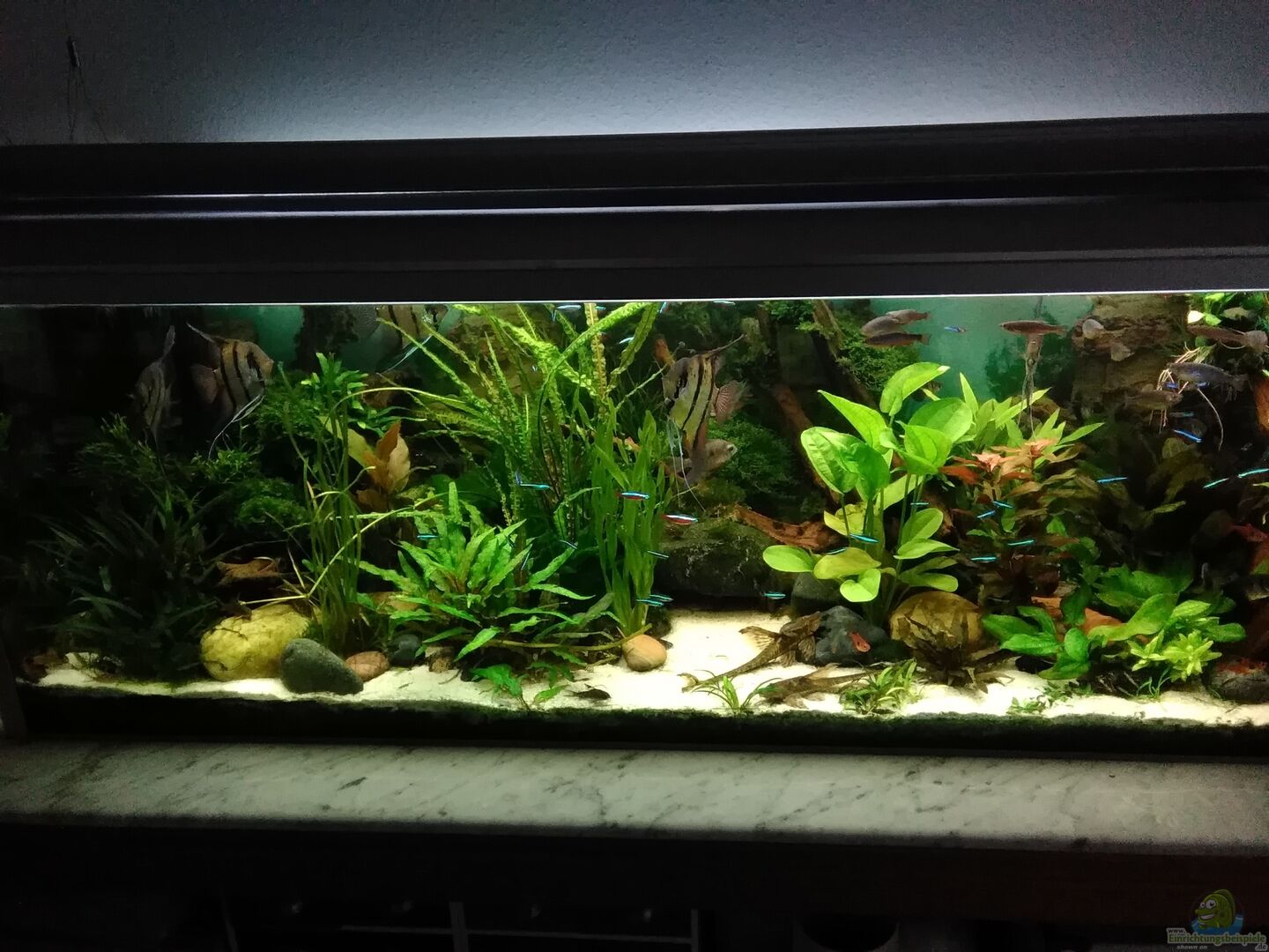 Juwel-Becken, 8 mm Float-Glas, Bodenscheibe 10 cmm Verkleidet von uns mit L-Aluschienen zur besseren Optik auf selbst gezimmertem Tisch, Filter stehen rechts und links