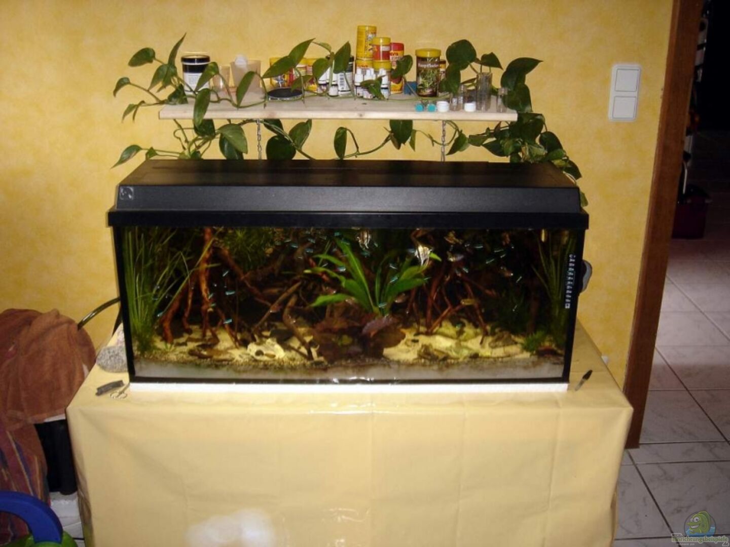 Die Abdeckung ist nur 30cm tief, die restlichen 10cm im hinteren Bereich sind offen. Die hintere Leuchtstofflampe hängt über dem offenen Bereich und es sind die Luftwurzeln von Efeututen-Zimmerpflanzen in das Becken gehängt. Die Efeututen ranken über dem Becken raus und schlängeln sich über die Abdeckung und das Regalbrett welches darüber hängt.