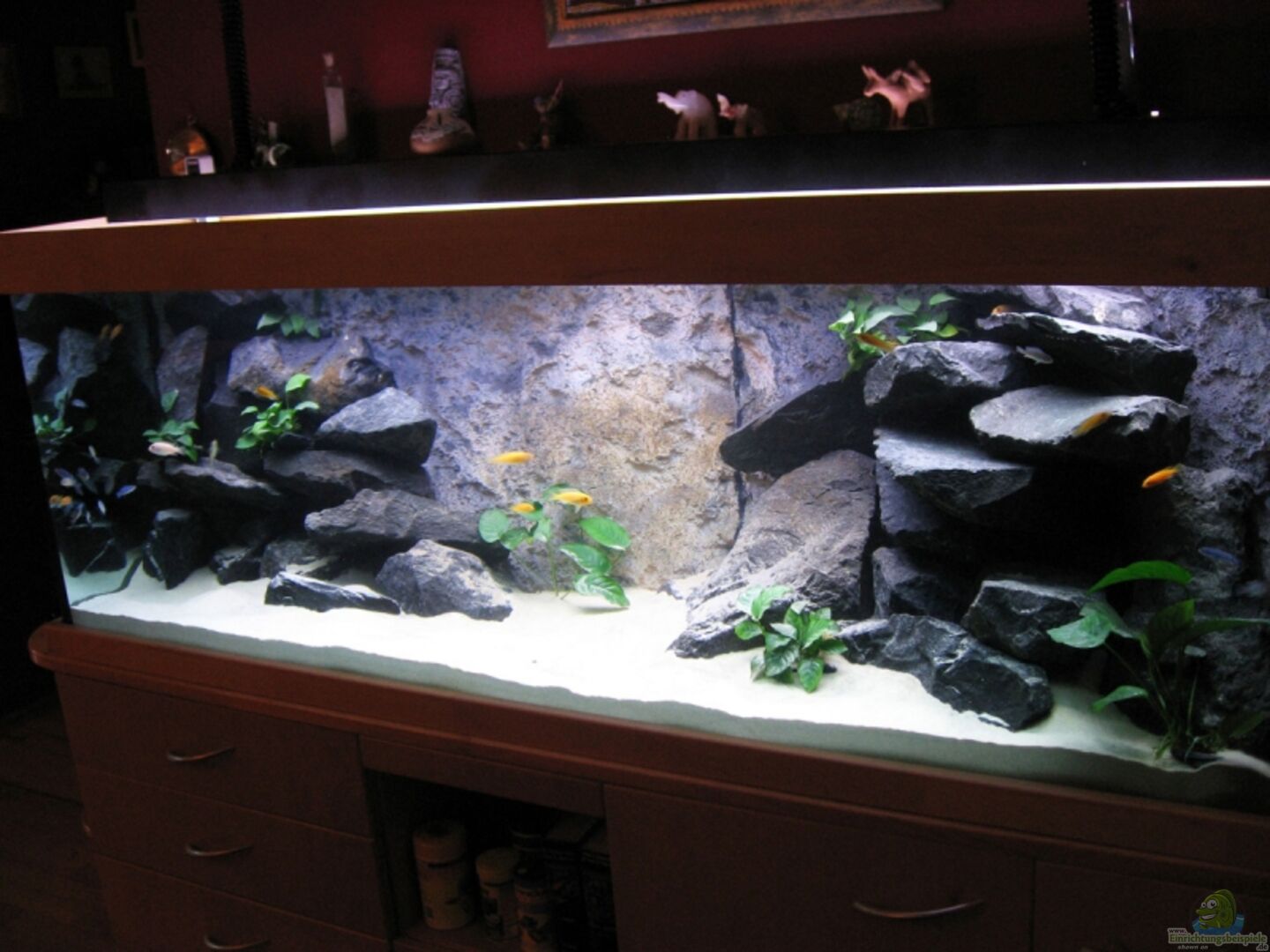 Bohrung an der rechten Seitenwand - daran angeschlossener Ablauf in den Abfluss für den Wasserwechsel.