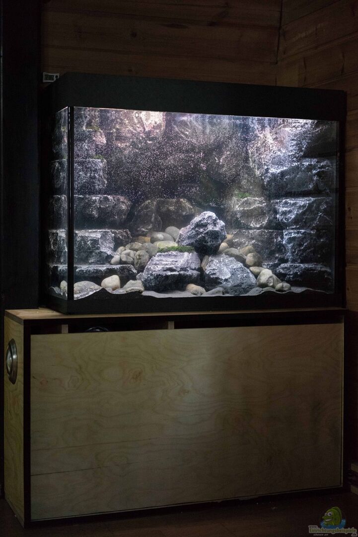Vom Aquarienbauer incl. Abdeckung. 12mm Floatglas, Wulstverklebt in Schwarz mit Sicherheits-innennaht. Hinten rechts befindet sich ein ??berlaufschacht mit zwei Kammern und abnehmbaren Kamm. Die Frontscheibe aus Wei??glas hat ein eher seltenes Seitenverhältniss von 100cm x70cm. Das ist eine recht kurze Kantenlänge, aber die Nische in der das AQ steht hat leider nicht mehr zugelassen. Die 70 für die Höhe waren vorallem eine ästhetische Entscheidung, das mehr an Wasservolumen sollte [...]