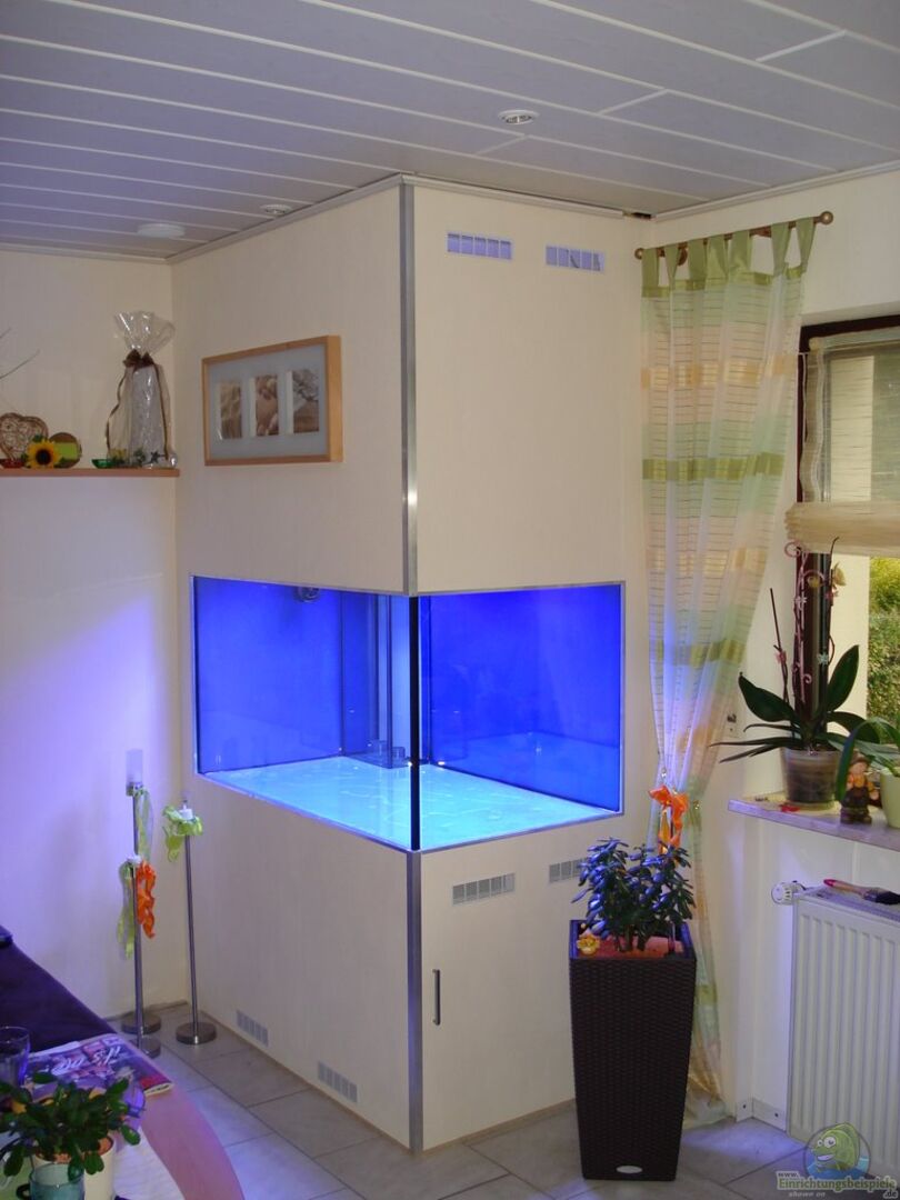 Das Becken wird mit einem Technikbecken im Unterschrank (93x40x35) betrieben. Das Becken ist in 3 Kammern eingeteilt: 1. Osmosewasser 2. Zulauf /Abschäumer 3. Rücklaufpumpe und Absorber (nach Bedarf) Der Ablaufschacht befindet sich in der linken hinteren Ecke und ist mit 3 Bohrungen (Zulauf / Ablauf / Notablauf) versehen.