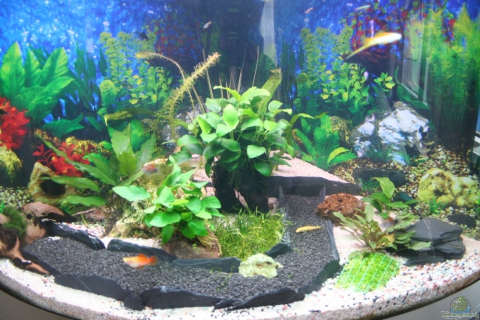 Aquarium und Unterschrank wurden komplett mit wei??er D-C-Fix Folie beklebt, sieht jetzt echt stark aus. Stra??e aus schwarzem Kies und Schiefer-Abgrenzung. Hinterer Bereich Terasse auch mit Schiefer Abgetrennt. Gembird ??berspannungsschutz-Steckdosenleiste mit 6 Steckdosenplätzen, 4 davon sind programierbar.
