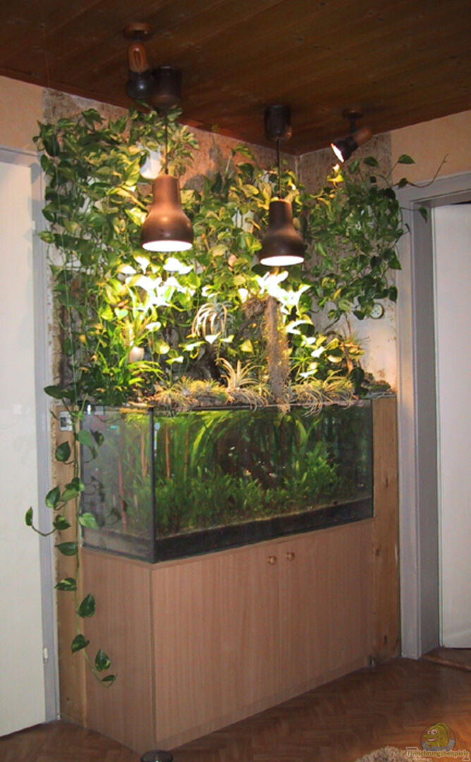 Das Paludarium wurde über Wasser komplett umgestaltet. Die beiden 125 Watt HQL-Strahler wurden gegen gebrauchte 70 Watt Duplalux-LI Seilzugleuchten, die neu lackiert wurden, getauscht. Die Pflanzen in den Hydrokulturtöpfen wurden entfernt, da diese derma??en ausgewachsen waren und das ganze Paludarium zugewuchert hatten (viele lange Ranken die kahl waren und nur noch an den enden Blätter hatten). An den Wänden über dem Aquarium wurden Korkplatten, an denen Kokosnuss- und Paranussschalen [...]