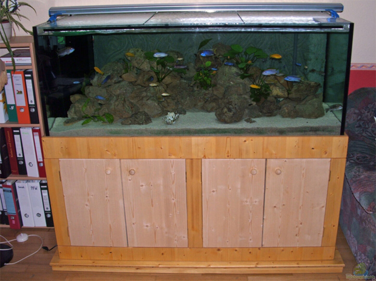 Schwarzer Filterschacht mit Bohrung für Ablauf zum Filterbecken, zweite Bohrung für Rücklauf vom Filterbecken ins Aquarium; Unterschrank Eigenbau (um Alurahmen drumherum gebaut); mit Glasscheiben abgedeckt