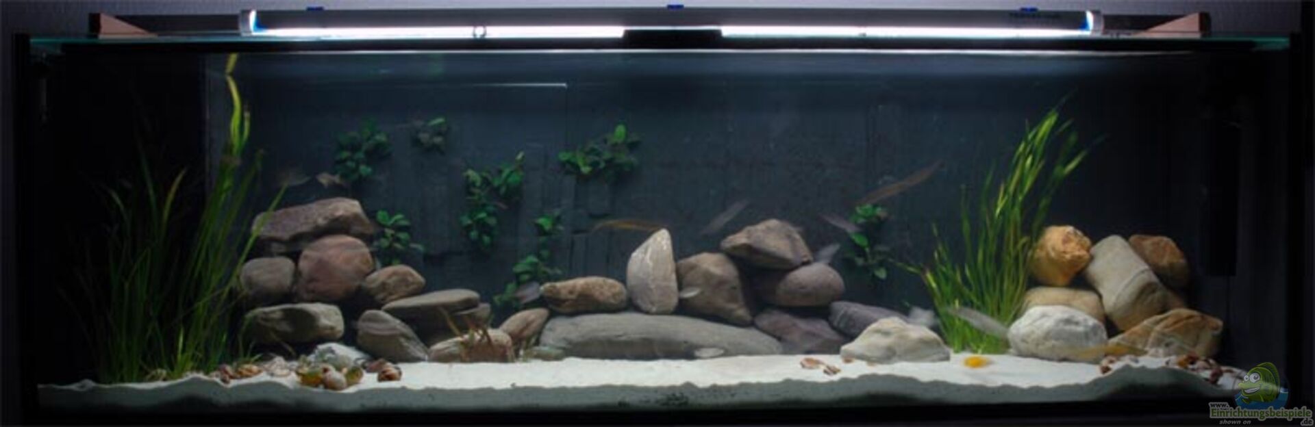 Ich wollte im Wohnzimmer ein Schaubecken haben, das den besonderen Reiz und die Eigenarten der verschiedenen Buntbarschgruppen des Tanganjika-Sees zeigt. Ausser den ´Aufwuchsfressern´ Tropheus & Co sollten alle relevanten Cichlidengruppen vertreten sein, also die sog. ´Höhlenbrüter´, die sog. ´Freiwassercichliden´, ´Schneckenbarsche´ und auch die ´Sandcichliden´ sollten nebeneinander weitgehend stressfrei leben können.Ferner habe ich versucht, jeweils ganz typische Vertreter zu wählen [...]
