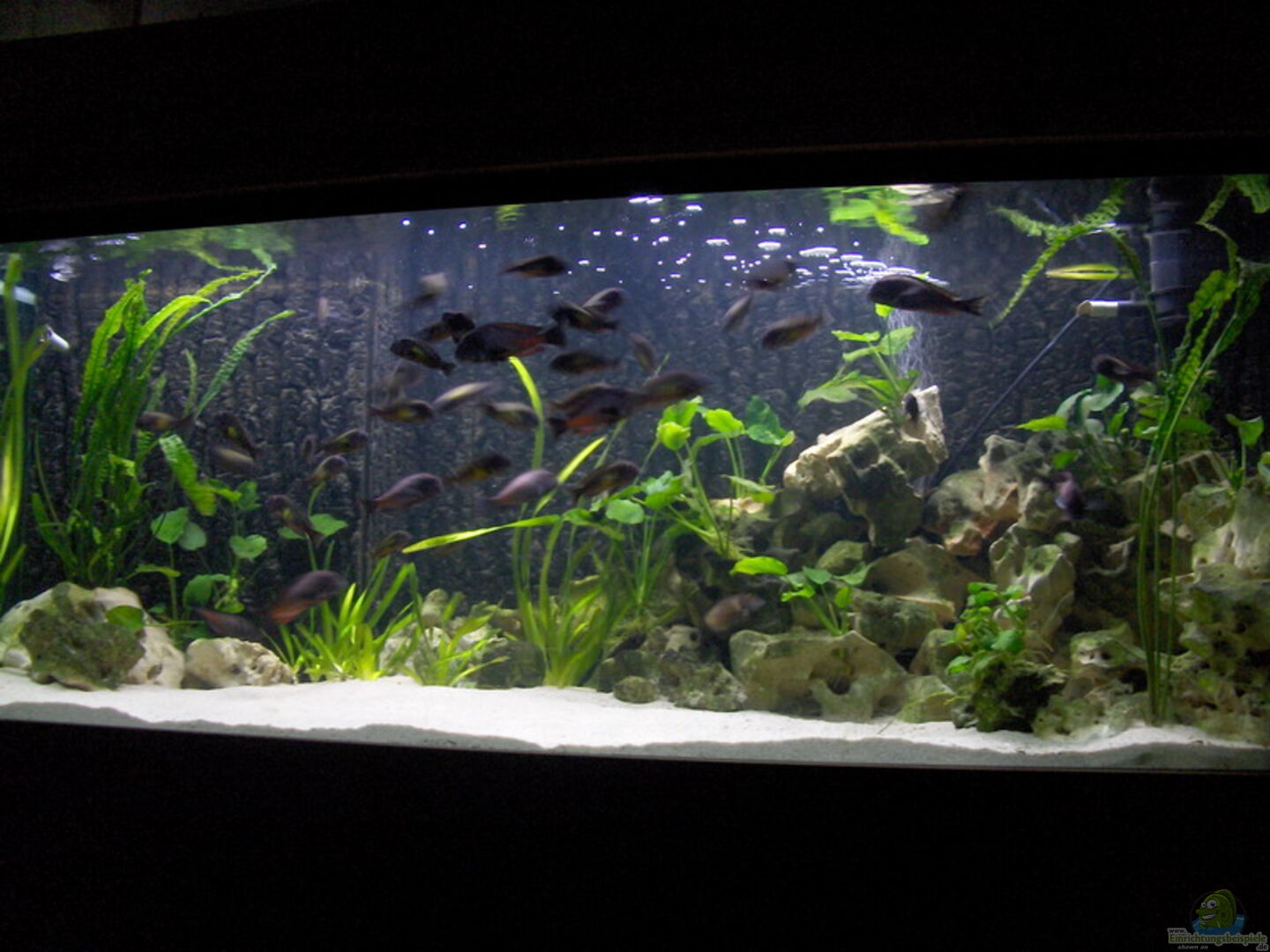 Die Glasstärke beträgt 12mm, das Becken ist schwarz Stoßverklebt und wurde mit einem eingeklebten 3 Kammerfilter ausgestattet. Untergestellt speziell angefertigt aus V2A und verkleidet mit Massivholz in gebeizter ´Antik-Obtik´.