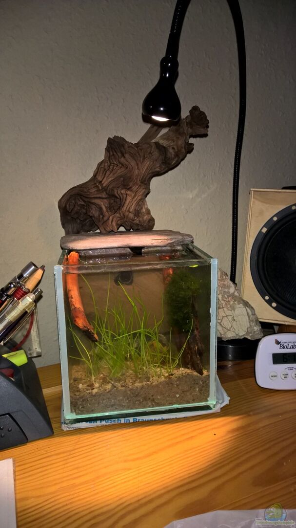 Dieses Becken ist ein kleiner Versuch das Füttern meiner Kakadubuntbarsche mit einer hübschen Schreibtischdeko zu vereinen. Da ich in meinem zweiten Becken keine ganze Tüte Wasserflöhe füttern möchte, habe ich nach einer Aufbewahrungsmöglichkeit gesucht. Im Keller fand ich dann dieses Minibecken und schon war die Idee geboren. Bin gespannt wie sich dieses sehr kleine Biotop entwickelt und ob sich eventuell die Wasserflöhe vermehren, sodass ich nicht ständig nachkaufen muss.