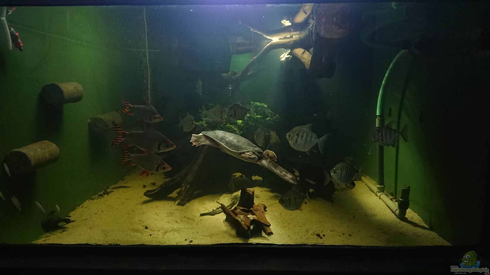 Das Becken besteht aus GFK und einer Frontscheibe. Ein Kellerraum ist durch die Frontscheibe abgetrennt worden und dahinter wurde dann mit Glasfasermatten und Epoxidharz das Becken gebaut. Die Filterung steht oberhalb des Beckens und besteht aus zwei 130cm Filterbecken.