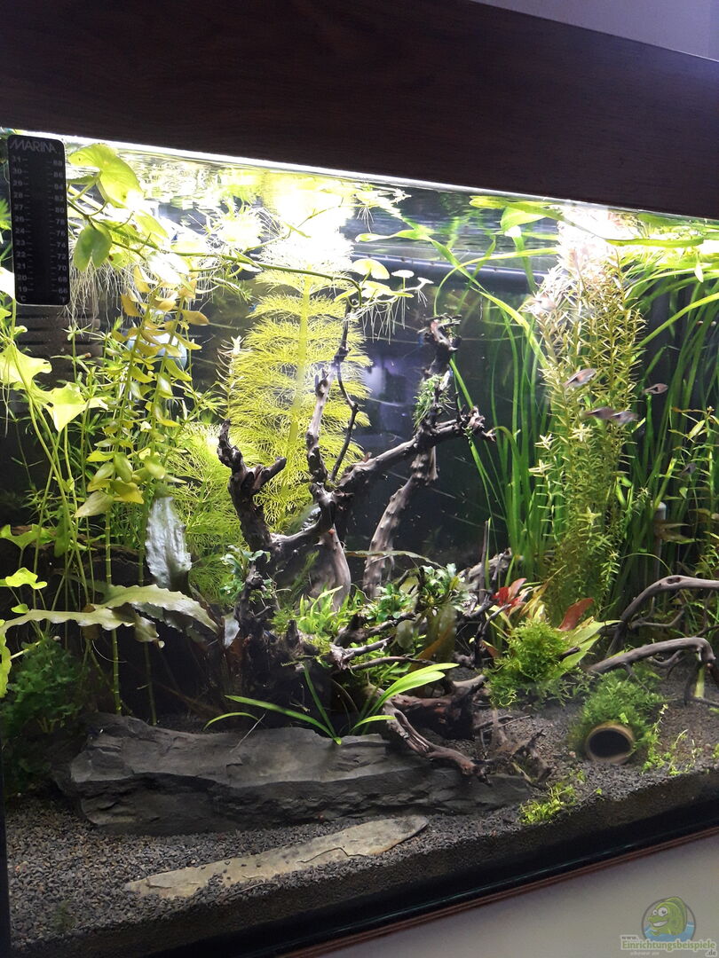 Rechts im Hintergrund wiegen sich Riesenvalisnerien in der sanften Strömung, die sich sanft über die Oberfläche legen und das Becken dort schön schummrig wirken lassen. Javafarn scheint aus einer zentral platzierten Wurzel zu spriessen. Daneben dienen zwei Cryptocoryne wendtii brown auch mal als grossblättrige Pflanze zum ausruhen oder als Schneckenrutsche. Aufgebunden auf den Wurzelspitzen finden sich Weepingmoos, Bucephalandra(Wavy Leaf) und Anubias barteri nanaPangolino. Links im Hintergrund [...]