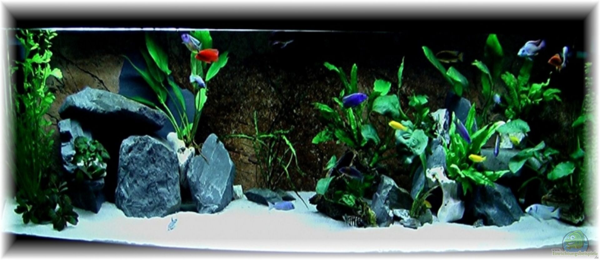 Da AQ ist Sto??verklebt und hat 12 mm Glas. Die Frontscheibe ist gewölbt. Das AQ wurde nach eigenen Wünschen angefertigt mit Abdeckung und Unterschrank. Bis Mai 2007 wurde es als Gesellschaftsbecken betrieben. Ab 15.7.2007 als Malawibecken eingerichtet. Läuft seit 20.7.2007