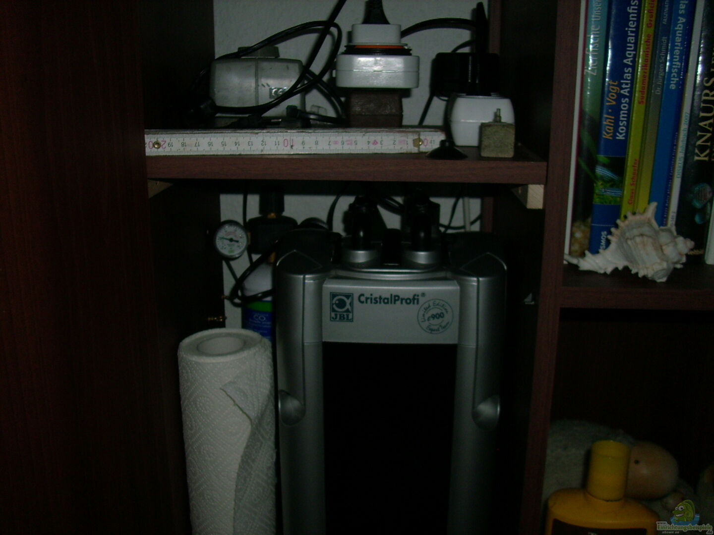 - Fluval Regelheizer (200 Watt) -> eingestellt auf 26° - Belüftungspumpe mit Sprudelstein: nicht in Betrieb (ist für Notfälle) - Marina Aqua Minder: gibt mir die genaue Temperatur an - Herkömmliches Thermometer (Glasrohr...), ich verlasse mich nie ganz auf die Technik. - 2x mechanische Zeitschaltuhr: 1x für Neonröhren/ 1x für das Mondlicht - Dennerle CO2 Anlage: Comfort Line für Aquarien bis 300 Liter 1x CO2 Einwegvorratsflasche (500 g) 1x CO2 Druckminderer 1x CO2 [...]
