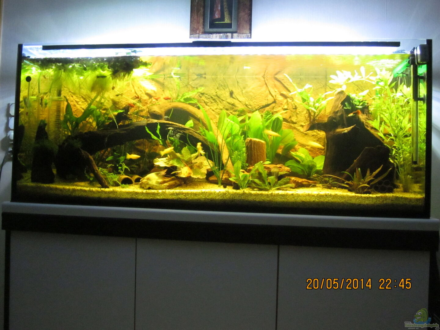 Der Unterschrank ist ein Eigenbau des Erstbesitzers aus Kanthölzern, einer Küchenarbeitsplatte und einer Aquarienunterlage von JBL. Die drei Türen die die Technik und viele Utensilien verbergen sind aus Sperrholz, mit handesüblichen Möbelgriffen aus Alu und werden mit Magneten an den Kanthölzern gesichert.Hier hat sich der Erbauer richtig Gedanken gemacht, vielen Dank.