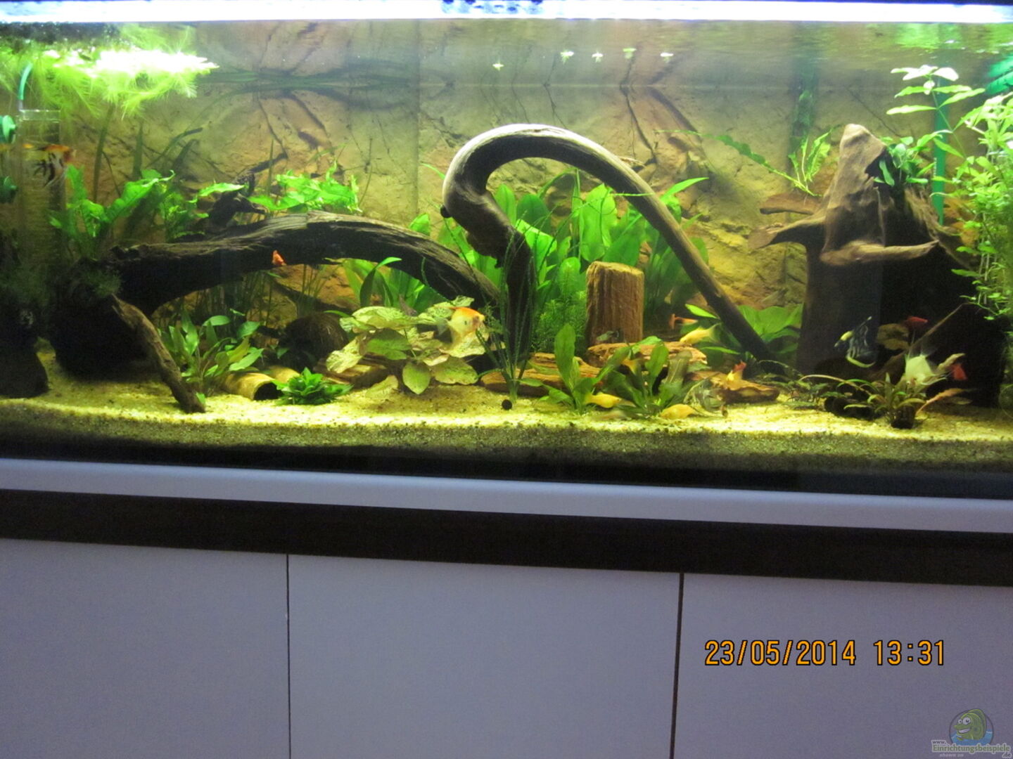 Der Unterschrank ist ein Eigenbau des Erstbesitzers aus Kanthölzern, einer Küchenarbeitsplatte und einer Aquarienunterlage von JBL. Die drei Türen die die Technik und viele Utensilien verbergen sind aus Sperrholz, mit handesüblichen Möbelgriffen aus Alu und werden mit Magneten an den Kanthölzern gesichert.Hier hat sich der Erbauer richtig Gedanken gemacht, vielen Dank.