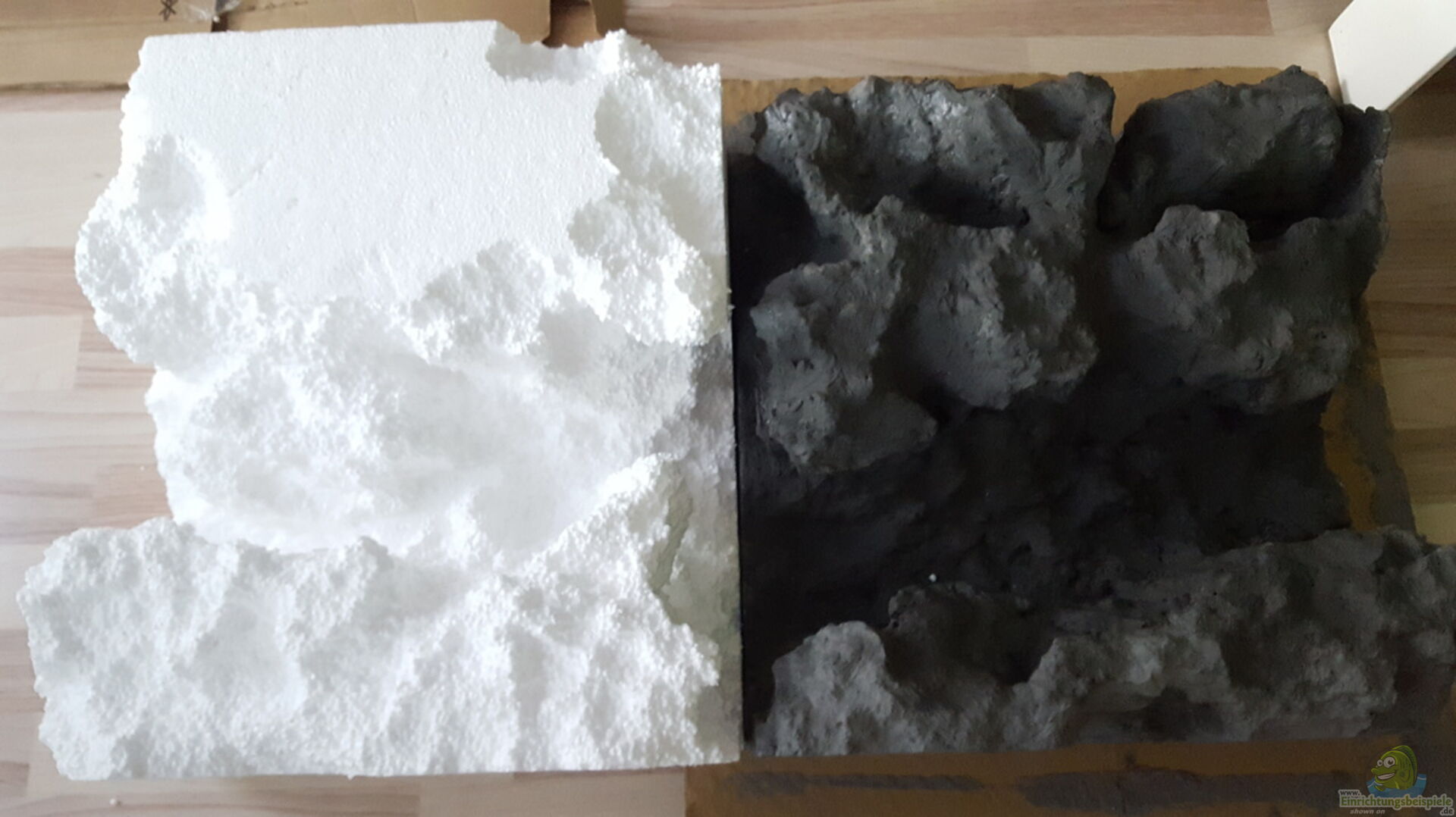 3D Rückwand selbstgebaut aus Styropor und Aquariumzement Diverse Gesteinsbrocken übereinander gestapelt.