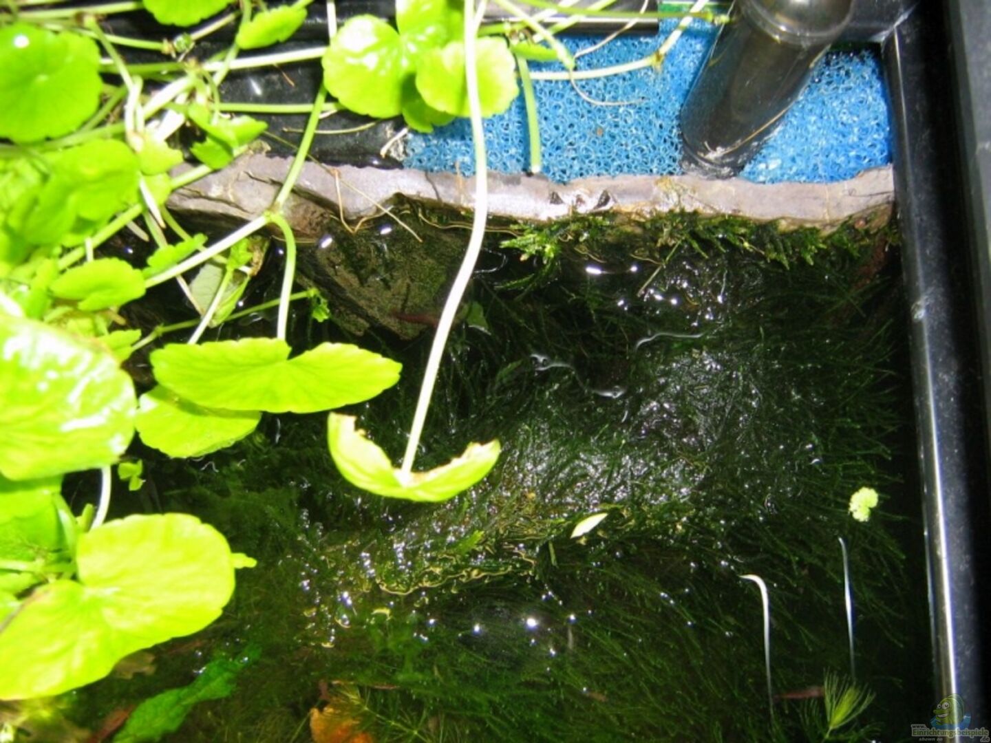 - Anubias barteri var. nana - Ceratophyllum demersum - Didiplis diandra - Echinodorus cordifolius - Echinodorus tenellus - Eusteralis stellata - Hydrocotyle leucocephala - Hydrocotyle verticala - Lysimachia nummularia - Microsorium pteropus - Vesicularia dubyana auf dem Düsenrohr des Filters gebunden