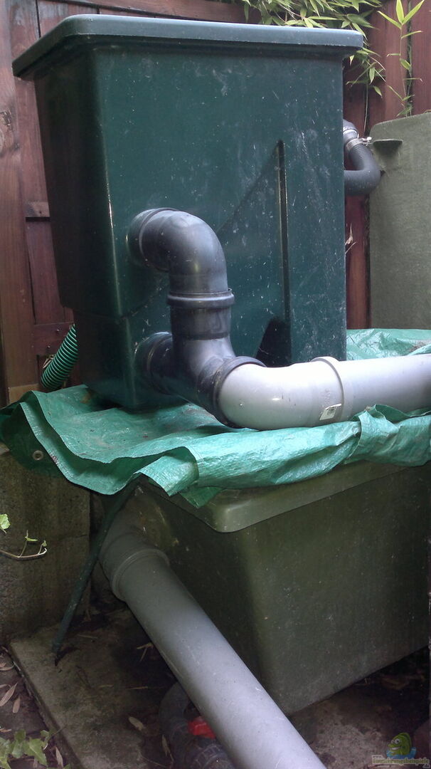 Y-Verteiler (regelbar) zur Einstellung der Filterspeisung 2/3 GFK-Filter und 1/3 Rieselfilter Mambramluftpumpe (regelbar) max. 500l/h (Betrieb ganzjährig! Wird im Winter auf der ersten Tiefenstufe plaziert und hält so ca. 60cm Eisfrei)