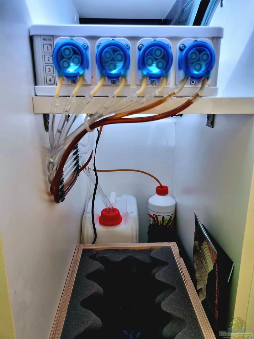 GHL-Doser 2.1 Dosierpumpe zur automatischen Düngung CO2 Anlage mit Nachtabschaltung und 2kg Flasche JD-Aquatec CO2-Reaktor mit integriertem Bypass Eheim Air 200 Luftpumpe zur Sauerstoffversorgung der Pflanzen und Fische während der Nacht Grässlin Futterautomat Rondomatic 400 (wird nur bei Bedarf angebaut) Osmoseanlage Profiline X3 600GPD und 2 Mischbettharzfilter für den Wasserwechsel Juwel SmartCam