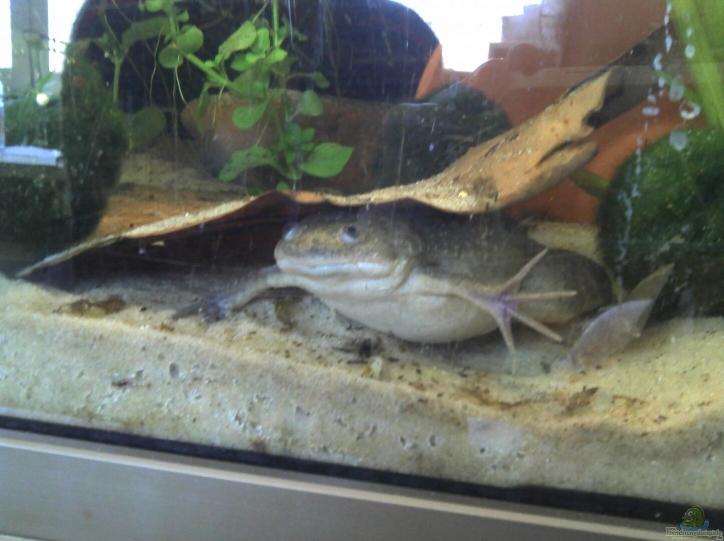 Xenopus laevis, 4 Weibchen 1 weiblicher Naturfarbender (Gitti), geboren wahrscheinlich im Sommer 2012, eingezogen am 20.04.2013, in tierärztlicher Behandlung wegen im Bein eingelagerter Lymphflüssigkeit im August 2014 (tägliche Bäder in isotonischer Kochsalzlösung) - seit Anfang 2015 symptomfrei 1 weiblicher Naturfarbender (Happy), geboren 2013, eingezogen 28.12.2014 1 weiblicher Naturfarbender (Louanne), geboren 2013, eingezogen am 28.12.2014 1 weiblicher Albino (Gemma), geboren [...]